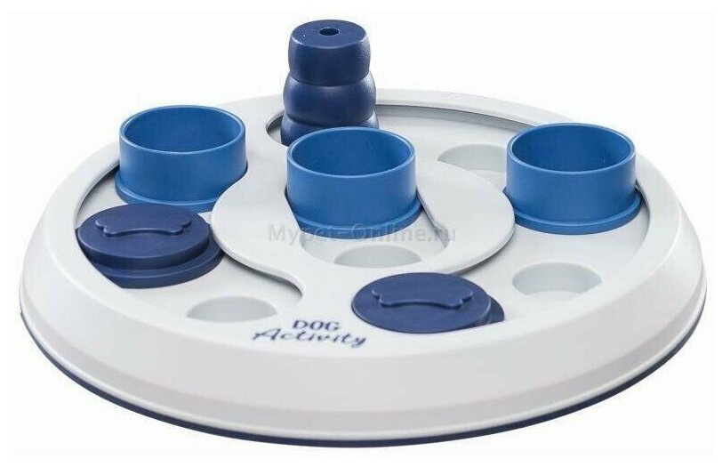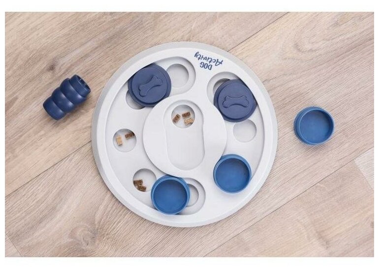Развивающая игрушка Flip&Fun для собак представляет собой круглое основание с различными элементами для игры.Игрушка не только развивает моторику и ловкость собаки, но и приносит много радости вашему любимому питомцу!На основании предусмотрены 4 отделения с двигающимися элементами-колпачками, под которыми можно спрятать лакомство. Отодвигая и сбрасывая лапками колпачки собака получает угощение в награду!Преимуществасобака получает удовольствие, используя различные техники для открытия отделений;настольная игра с конусом и ползунками с углублениями;использование конуса в качестве ограничителя повышает уровень сложности;не скользит благодаря резиновому покрытию на основании;можно мыть в посудомоечной машине;брошюра с рекомендациями по проведению тренировок в комплекте.