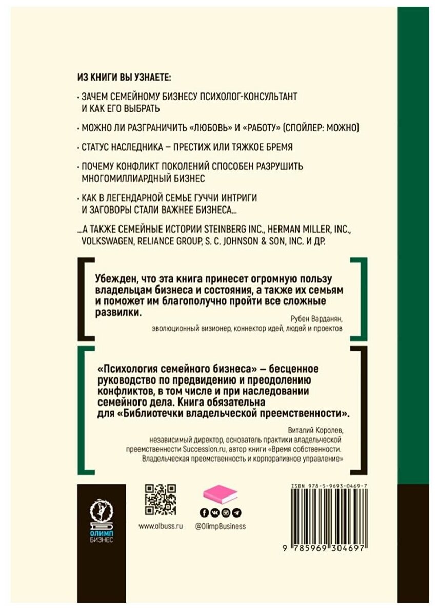 Семья - это всегда сложно. А еще сложнее, когда у членов семьи есть совместный бизнес. Деловые вопросы часто начинают уходить на второй план, уступая место межличностным конфликтам и извечной проблеме "отцов и детей". Авторы книги с помощью психоаналитического подхода и системного анализа разбирают кейсы известных бизнес-семей, включая мегапопулярных и скандальных Гуччи. На этих примерах (позитивных и не очень) читатели могут научиться, например, выстраивать границы между любовью и работой или решать вопросы с наследством. Книга серьезная и нестандартная. У бизнес-семей, особенно в нашей стране, редко возникает мысль обратиться к консультанту, который мог бы помочь родственникам решить не только рабочие, но и межличностные проблемы. Книга не сможет полностью заменить живого консультанта, но в ней содержатся уникальные советы и методики, эффективность которых проверена и доказана. Я могу смело рекомендовать эту книгу всем предпринимателям, которые ведут совместное дело с родственниками.