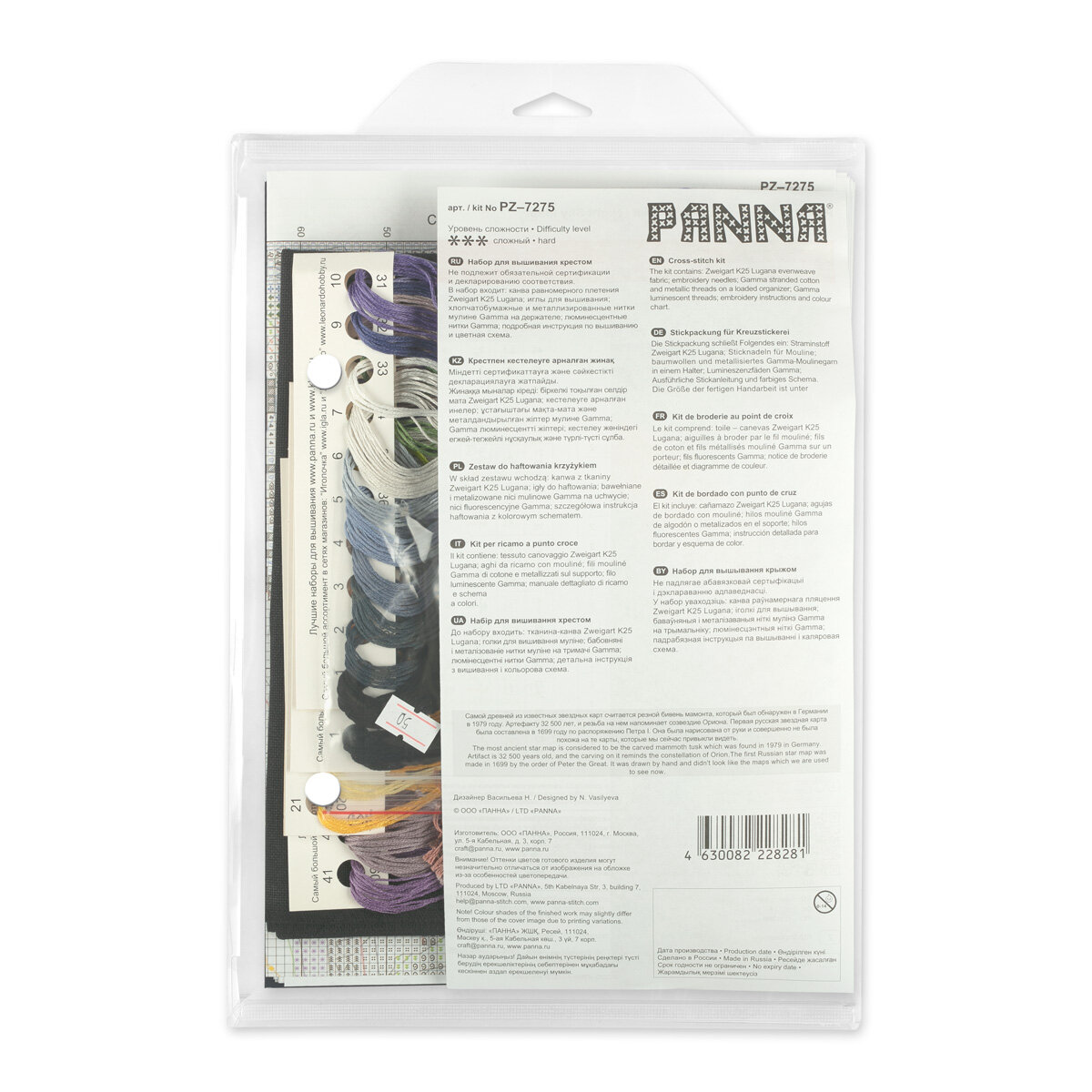 Набор для вышивания PANNA "Карта звездного неба" 70 x 50 см. В набор для вышивания PANNA входит: канва Zweigart Linda K27, хлопчатобумажные нитки мулине Gamma на держателе, люминесцентные нитки, игла для вышивания Gamma, цветная схема, инструкция по вышиванию. Люминесцентные нитки используются в созвездиях и придают им эффектное свечение в темноте! Размер готовой работы: 70 х 50 см. Самой древней из известных звездных карт считается резной бивень мамонта, который был обнаружен в Германии в 1979 году. Артефакту 32 500 лет, и резьба на нем напоминает созвездие Ориона. Первая русская звездная карта была составлена в 1699 году по распоряжению Петра I. Она была нарисована от руки и совершенно не была похожа на те карты, которые мы сейчас привыкли видеть. Заполнение: Частичное. Количество цветов: 50. Уровень сложности: 3. Цвет канвы - черный