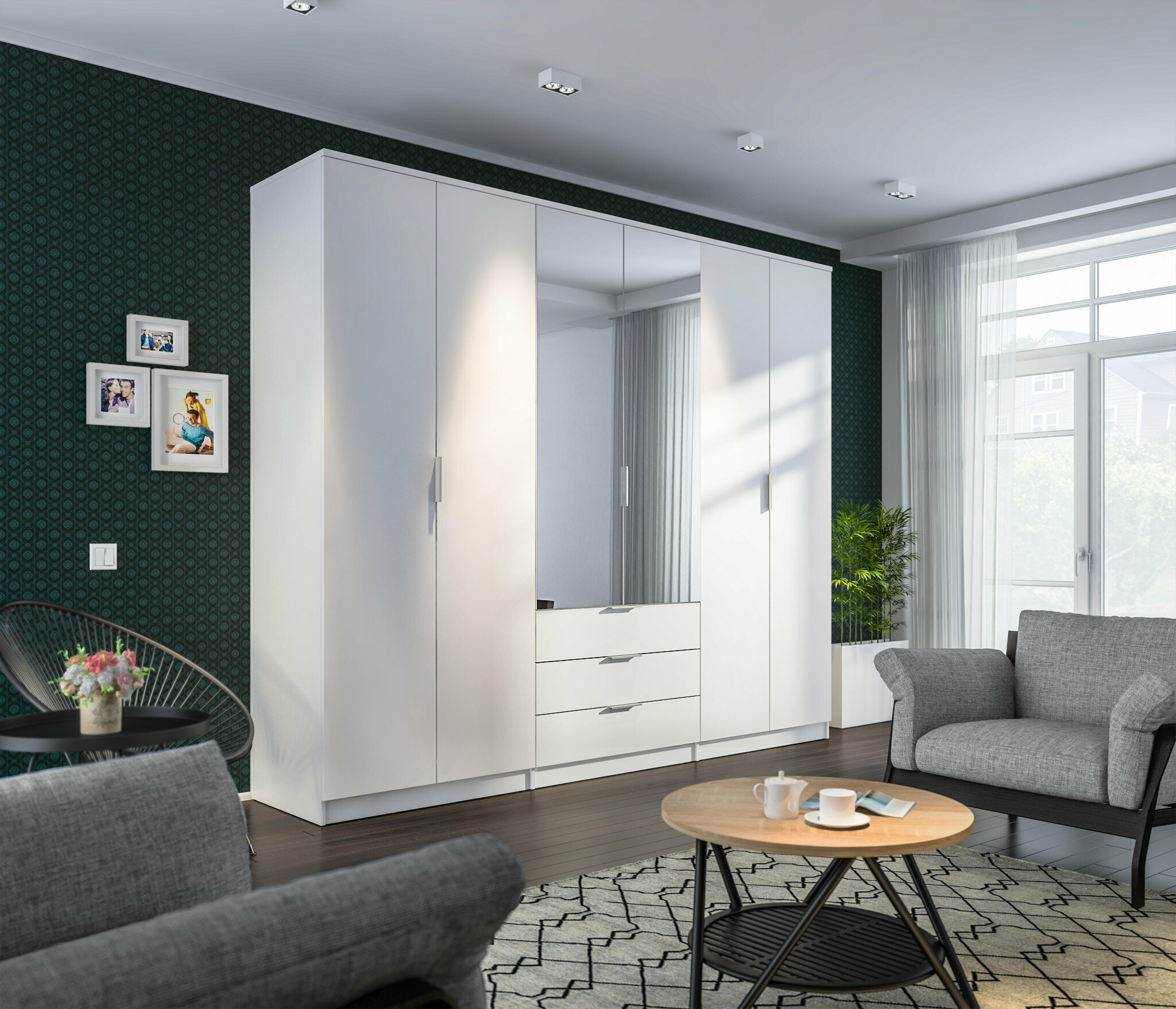 Шкаф «Николь» 6-ти дверный - идеальное решение для хранения. В комплект входит два полноценных шкафа с нишей и вешалкой под одежду, большое зеркало и комод для мелких вещей. Шкафом можно дополнить спальный гарнитур, укомплектовать прихожую, или разместить его в небольшой квартире-студии. Шкаф выполнен из качественного материала ЛДСП. Цвет белый.
