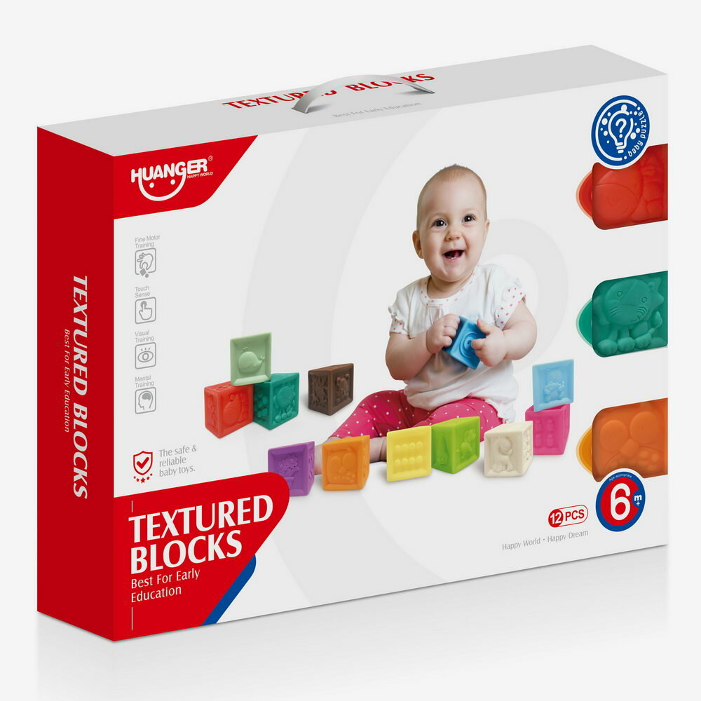 Двенадцать супер мягких и супер ярких кубиков с рельефными картинками созданы специально для маленьких детских ручек. Все стороны кубиков абсолютно разные, на них изображены цифры от 1 до 10, животные, предметы и узоры. Благодаря различным текстурам граней игра с кубиками прекрасно развивает мелкую моторику рук ребенка, зрительное восприятие, наблюдательность и внимание, цветовосприятие. Кубики изготовлены из безопасного материала, что позволяет вашему малышу их "грызть", их очень легко сжимать, а также с н
