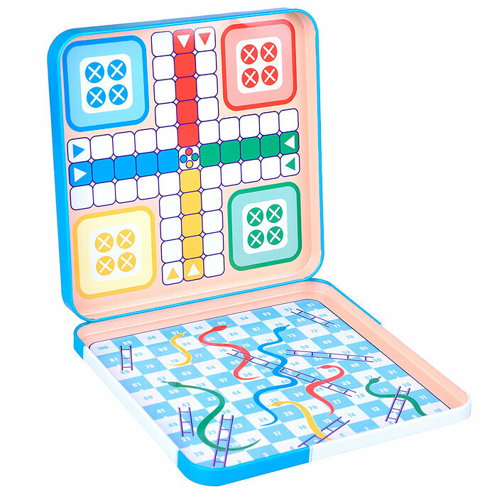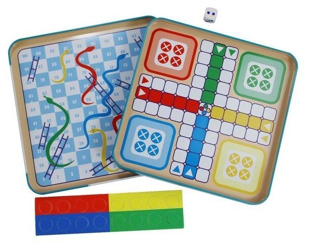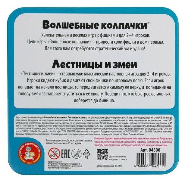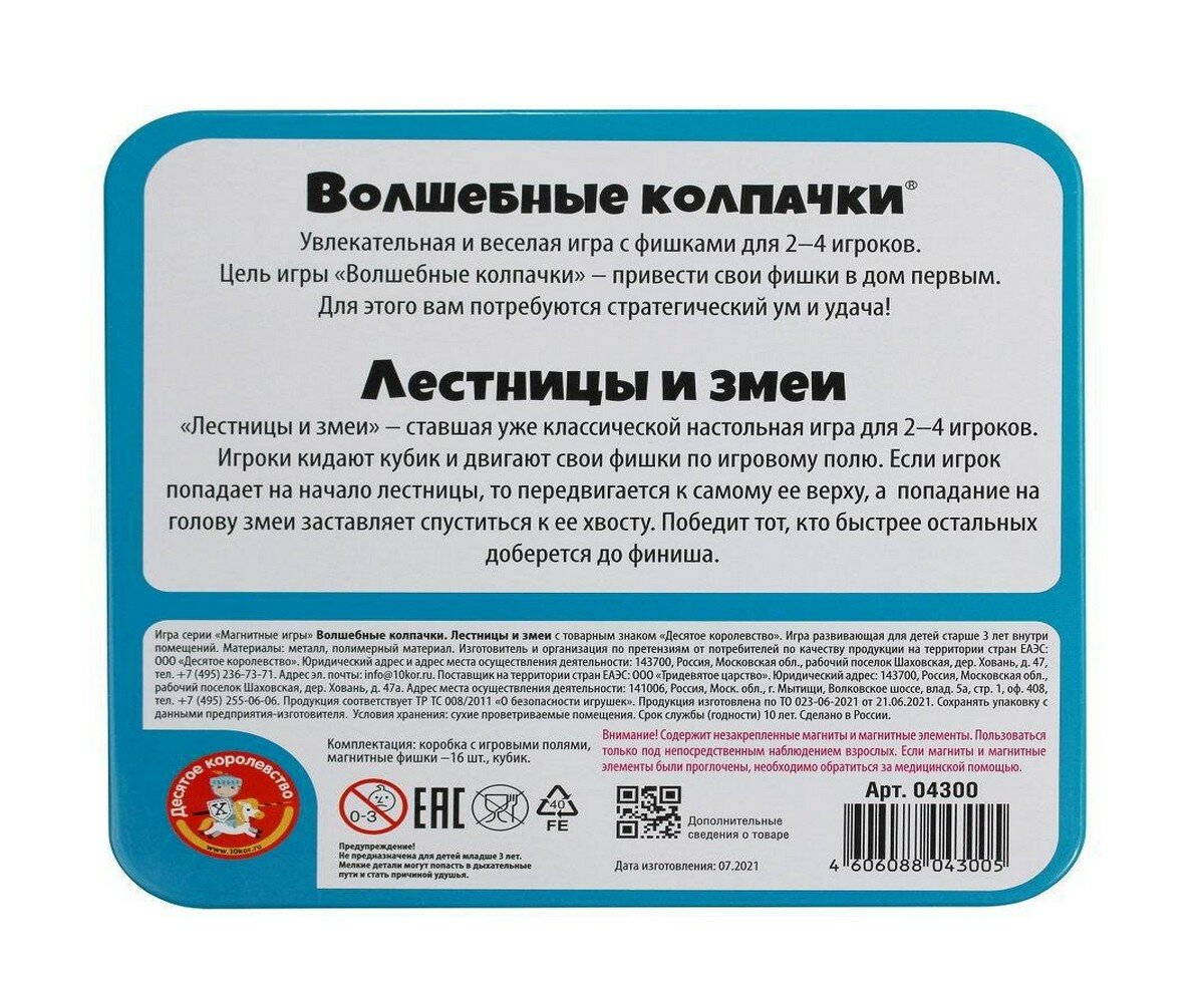 Игра представляет собой коробку, с одной стороны которой – поле для игры в «Волшебные колпачки», а с другой – в «Лестницы и змеи».