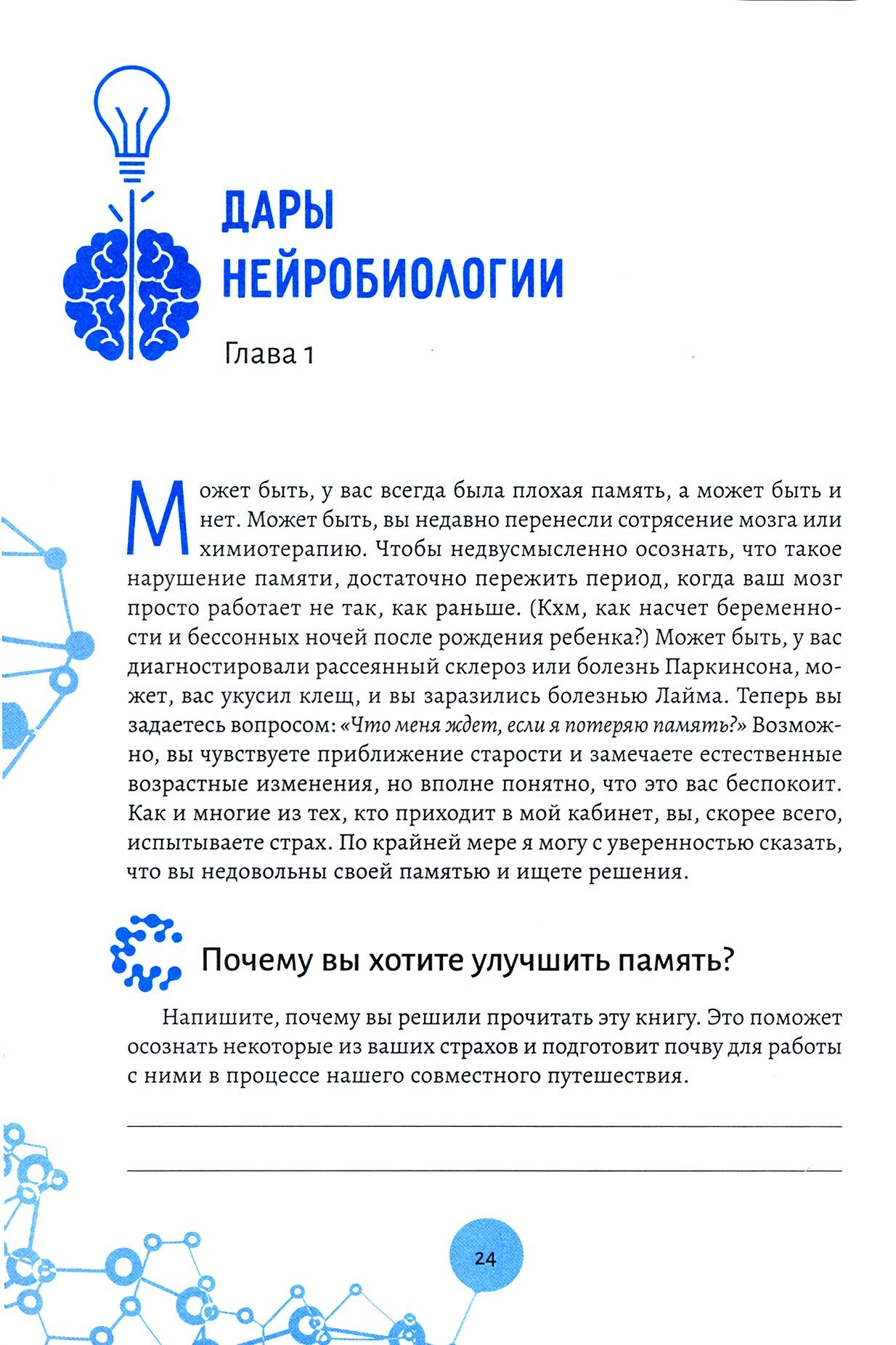 Потеря памяти - один из главных человеческих страхов, и не просто так. Каждый день мы полагаемся на свой мозг, его способность помнить, сопоставлять факты из прошлого и настоящего как при принятии важных решений, так и в повседневных делах. Данное учебное пособие призвано помочь вам сохранить ясность мышления в любом возрасте. В нем много практик и места для записи ваших мыслей, целей и планов, которые вы разработаете в процессе выполнения этих практик. Подобный самоанализ поможет укрепить свои сильные стороны в запоминании и заметить слабые. В каждой главе вы будете знакомиться с одним из принципов нейробиологии и с проверенной стратегией улучшения памяти. Автор расскажет, почему с возрастом память ухудшается, почему важно много двигаться и правильно питаться, как высыпаться и меньше нервничать. Вы закрепите эти знания с помощью упражнений, чтобы добиться устойчивых позитивных изменений. Ежедневная практика позволит получить максимальный эффект для вашего здоровья. Программа, описанная в этой книге, поможет стать более осведомленными в области нейробиологии и скорректировать свои привычки так, чтобы быстрее думать, острее чувствовать и радостнее жить.