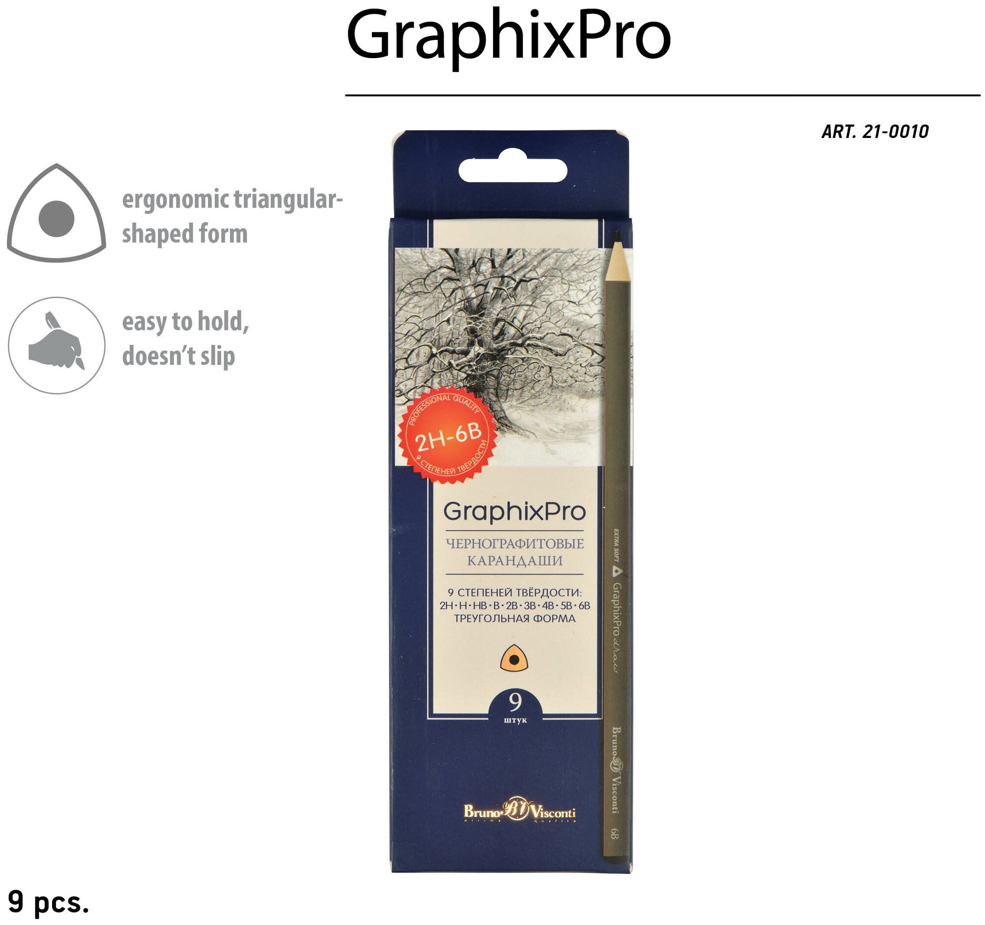 Чернографитовые карандаши GraphixPro бренда BrunoVisconti®. Набор состоит из 9 карандашей различной степени твердости: 2H-6B. Покрытие карандашей - лак на водной основе - это бережное отношение к окружающей среде и здоровью детей. Корпус имеет эргономичную трехгранную форму, удобную для длительного использования. Диаметр грифеля 2,0-3,0 мм. Упакованы в картонную коробку.