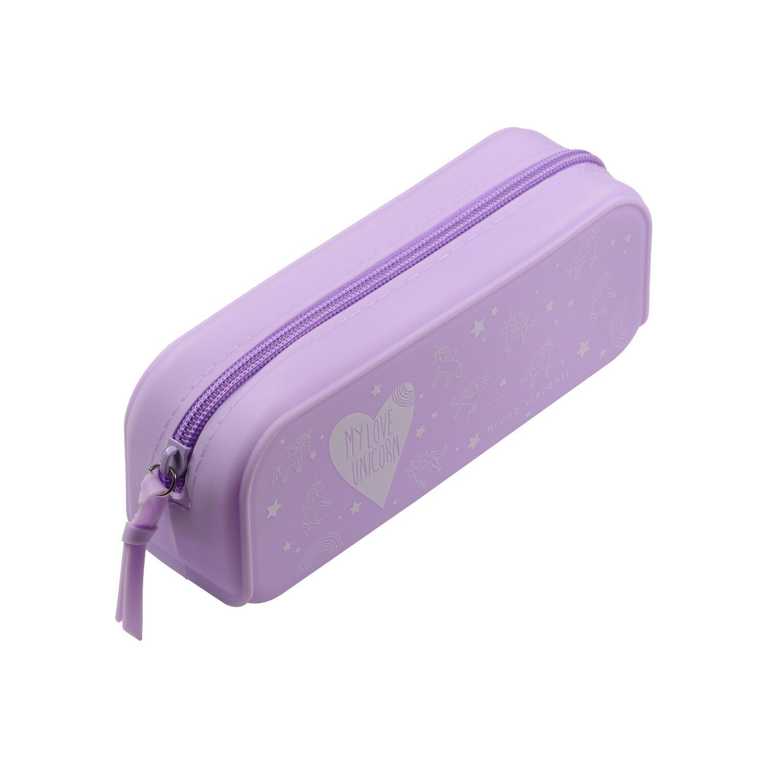Мягкий пенал из силикона из серии "Зефирные животные". Выполнен в нежно-сиреневой гамме, украшен принтом из единорогов и сердечком с надписью "My love unicorn". Это компактный пенал для школы и дополнительных занятий. Внутри одно отделение, где можно разместить канцелярские принадлежности, длиной до 18 см. Например, короткие кисти и линейки, ластики, стандартные ручки и карандаши. Пенал закрывается на молнию со специальным хлястиком, что позволяет быстро и удобно его открыть. Пенал легко моется, поэтому он дольше сможет сохранить аккуратный и опрятный вид. При желании можно составить комплект с другими товарами из этой серии: например, дополнить ручкой и карандашом.