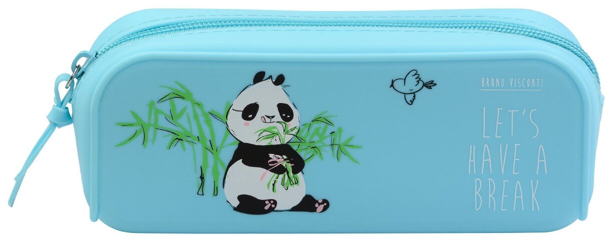 Яркий пенал из мягкого силикона "Панда с бамбуком". Это компактный пенал, который подойдет как дополнительный в школе или для внеклассных занятий. Застегивается на молнию с хлястиком, что помогает быстро и легко открыть и закрыть пенал. Внутри одно просторное отделение, куда можно сложить канцелярские товары длинной до 18 см. Это значит, что там поместятся стандартные ручки и карандаши, короткие кисти, линейки до 15 см. Пенал можно мыть, поэтому он может на долго сохранить аккуратный вид. Выполнен в ярко-голубом цвете с рисунком панды, птички и надписью "Let's have a break".