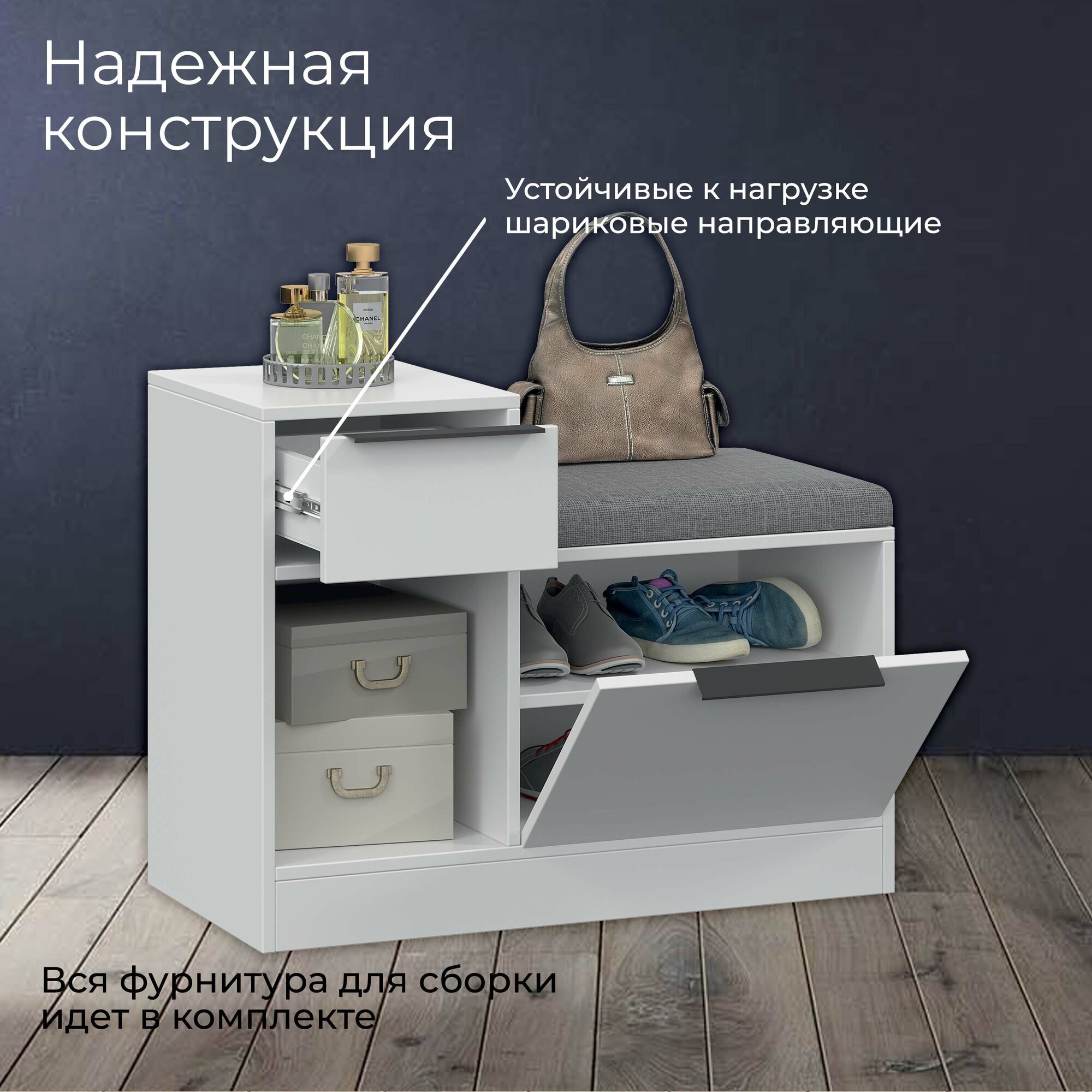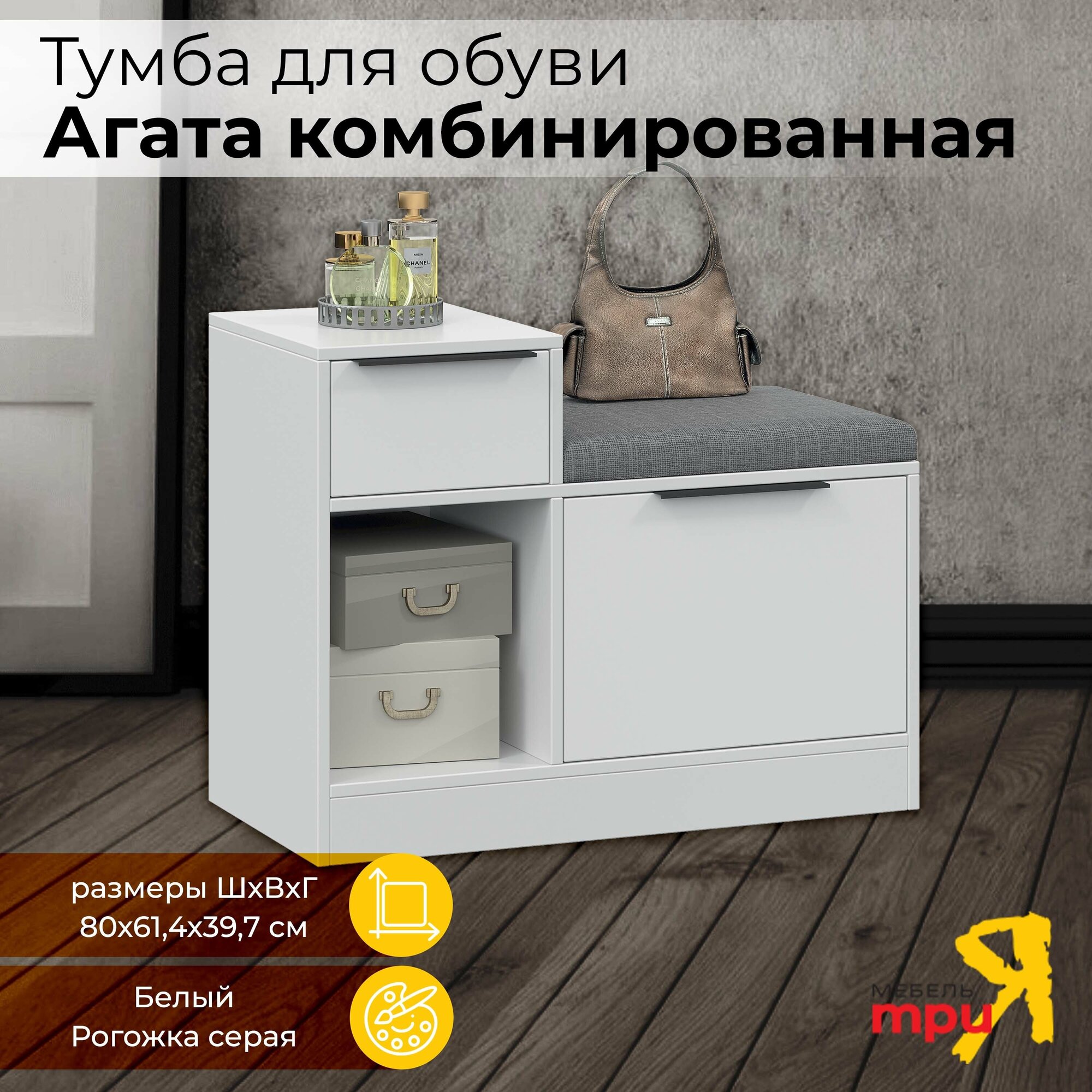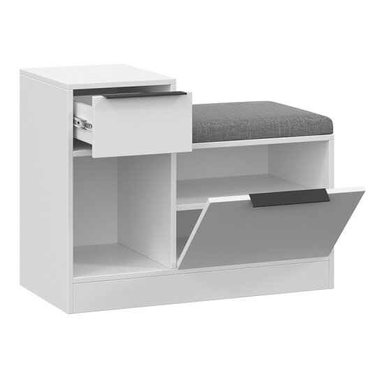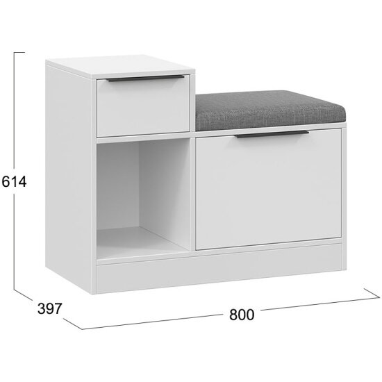 Тумба для обуви — компактный и функциональный предмет мебели, который идеально подойдет для современной прихожей. У модели 2 открытые вместительные полки, на каждой из которой можно хранить по 3 пары невысокой обуви: туфель, ботинок, кроссовок. Основные элементы конструкции изготовлены из белой матовой ЛДСП с торцевой кромкой. Крышка тумбы одновременно выполняет роль мягкого сиденья, на котором можно с комфортом обуваться и разуваться. В качестве обивки используется серая рогожка — прочная и долговечная ткань с выраженной фактурой. Максимальная нагрузка на сиденье не должна превышать 90 кг.
