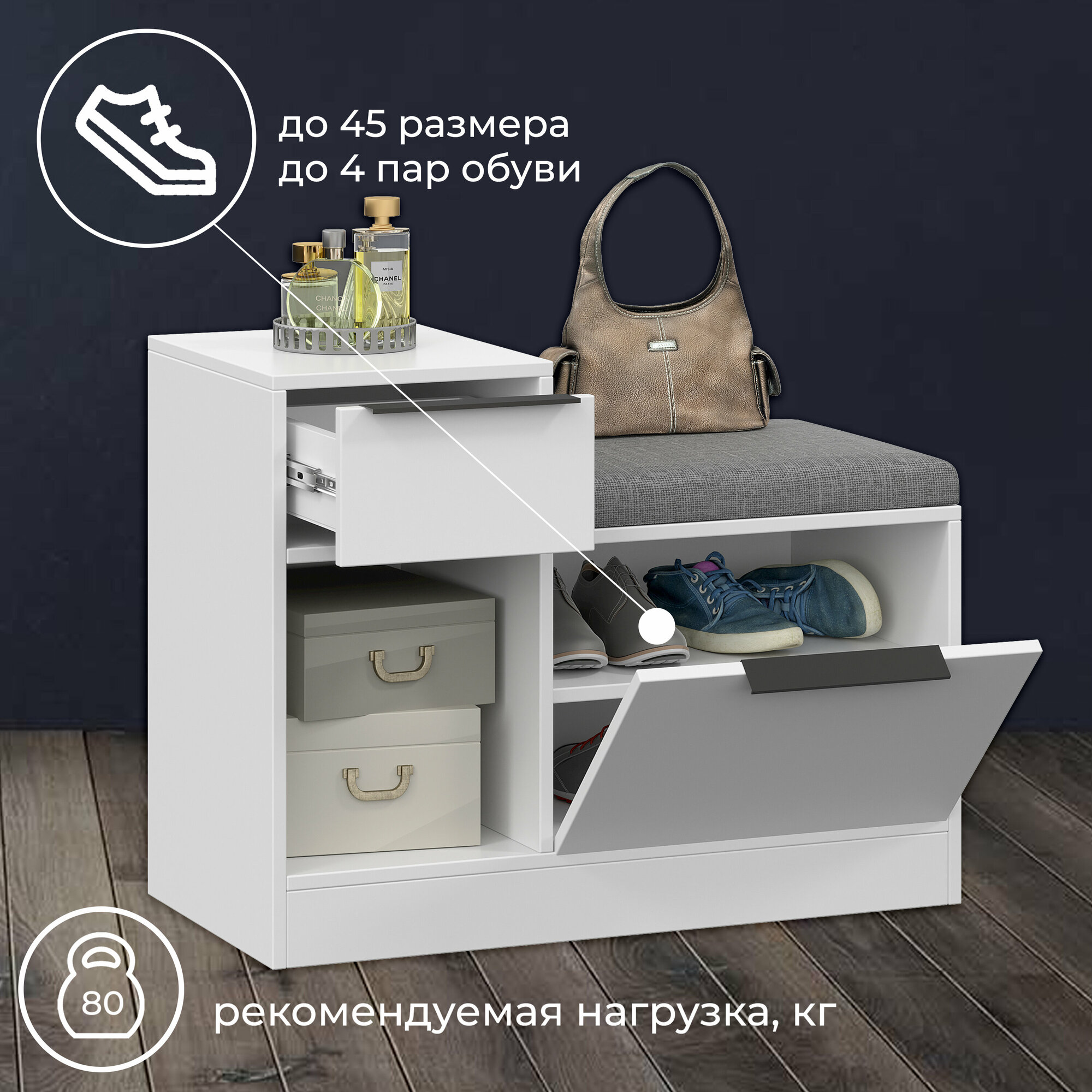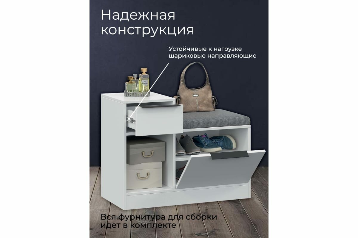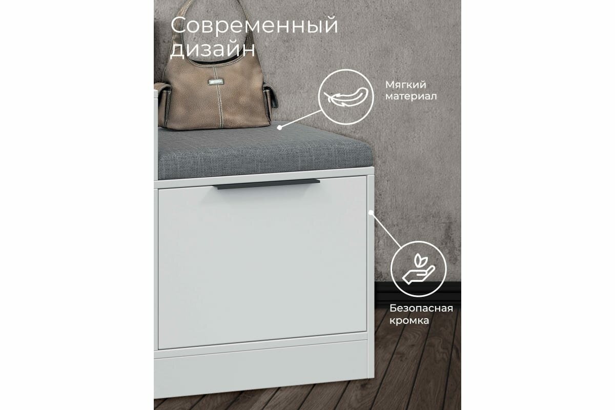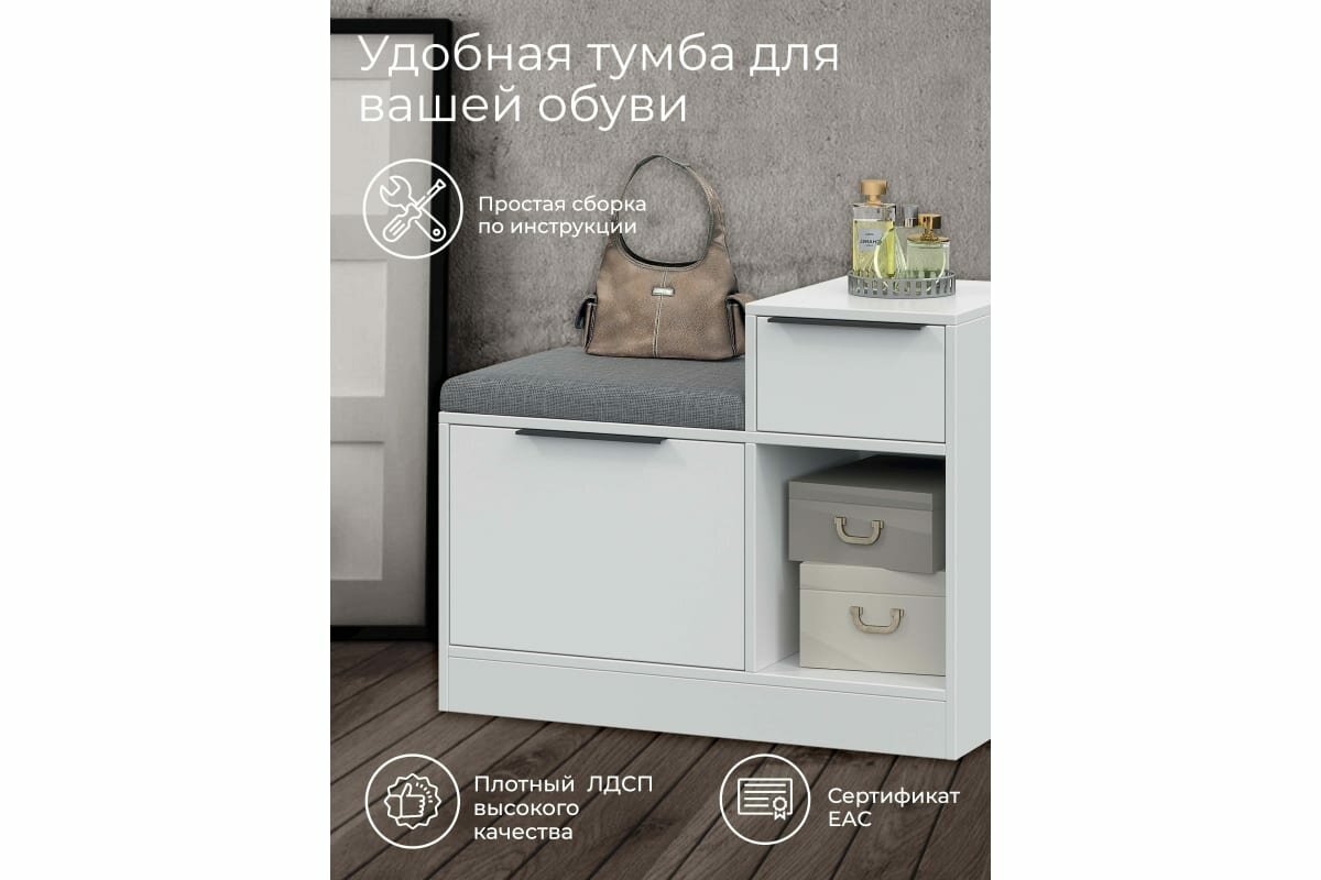 Где хранить любимые туфли, куда поставить сумку по возвращении домой, как переобуться с максимальным комфортом – ответы на эти вопросы поможет найти комбинированная тумба . Компактный модуль выполняет одновременно несколько функций – служит банкеткой, обеспечивает место для обуви и обувной косметики. Закрытое отделение с откидной дверцей способно вместить до 6 пар слипонов, балеток, кроссовок, босоножек. В небольшом, полностью выдвигающемся ящике не затеряются перчатки, ключница, солнечные очки. Мягкий элемент выполнен в обивке из практичной, простой в уходе рогожки.