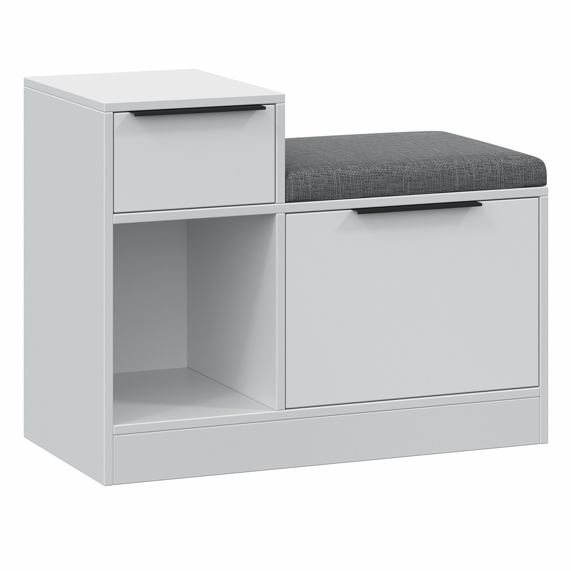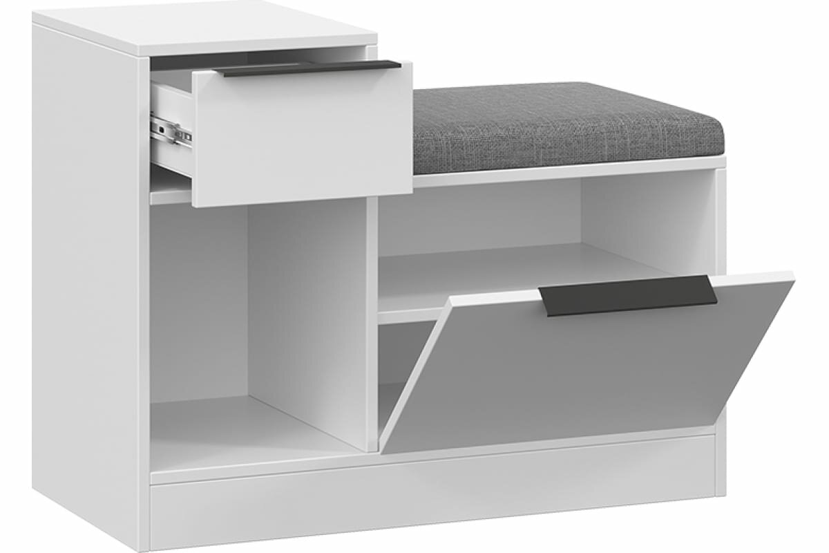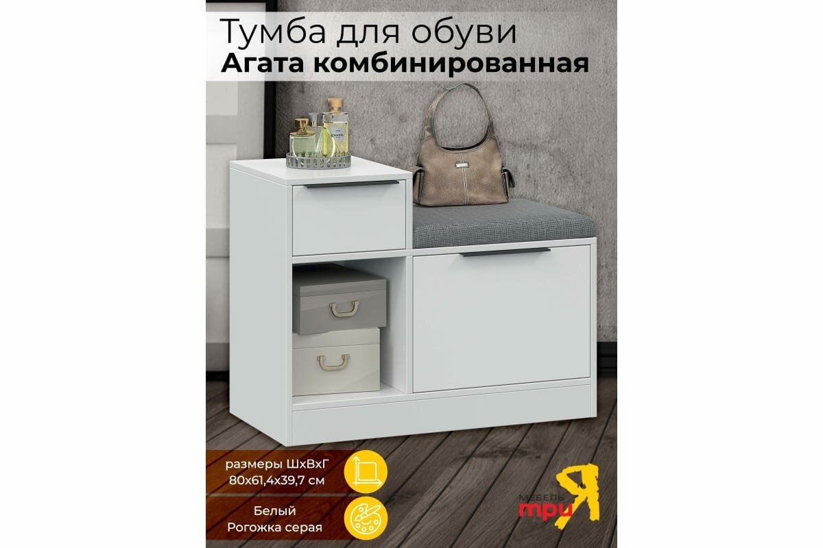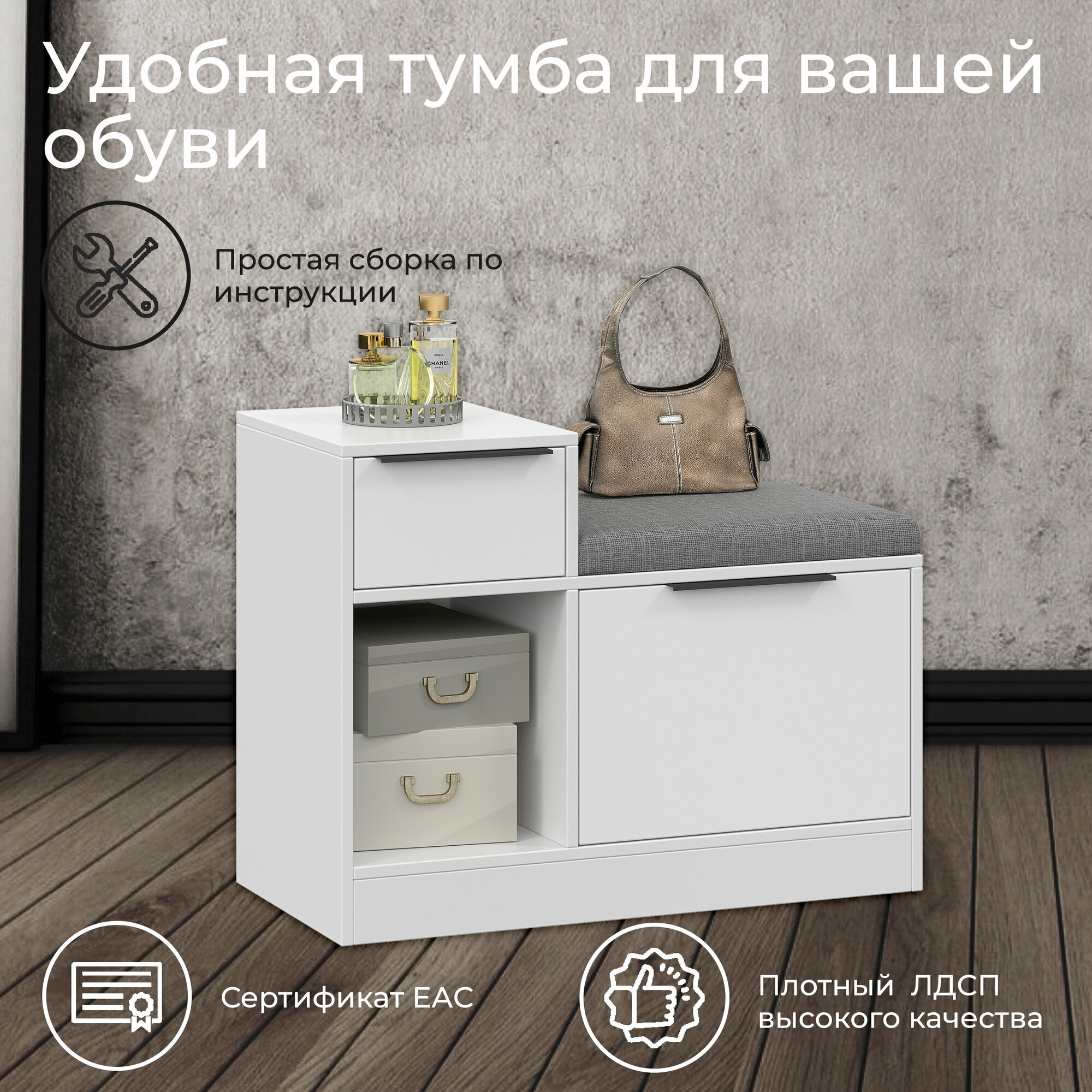 Где хранить любимые туфли, куда поставить сумку по возвращении домой, как переобуться с максимальным комфортом – ответы на эти вопросы поможет найти комбинированная тумба . Компактный модуль выполняет одновременно несколько функций – служит банкеткой, обеспечивает место для обуви и обувной косметики. Закрытое отделение с откидной дверцей способно вместить до 6 пар слипонов, балеток, кроссовок, босоножек. В небольшом, полностью выдвигающемся ящике не затеряются перчатки, ключница, солнечные очки. Мягкий элемент выполнен в обивке из практичной, простой в уходе рогожки.