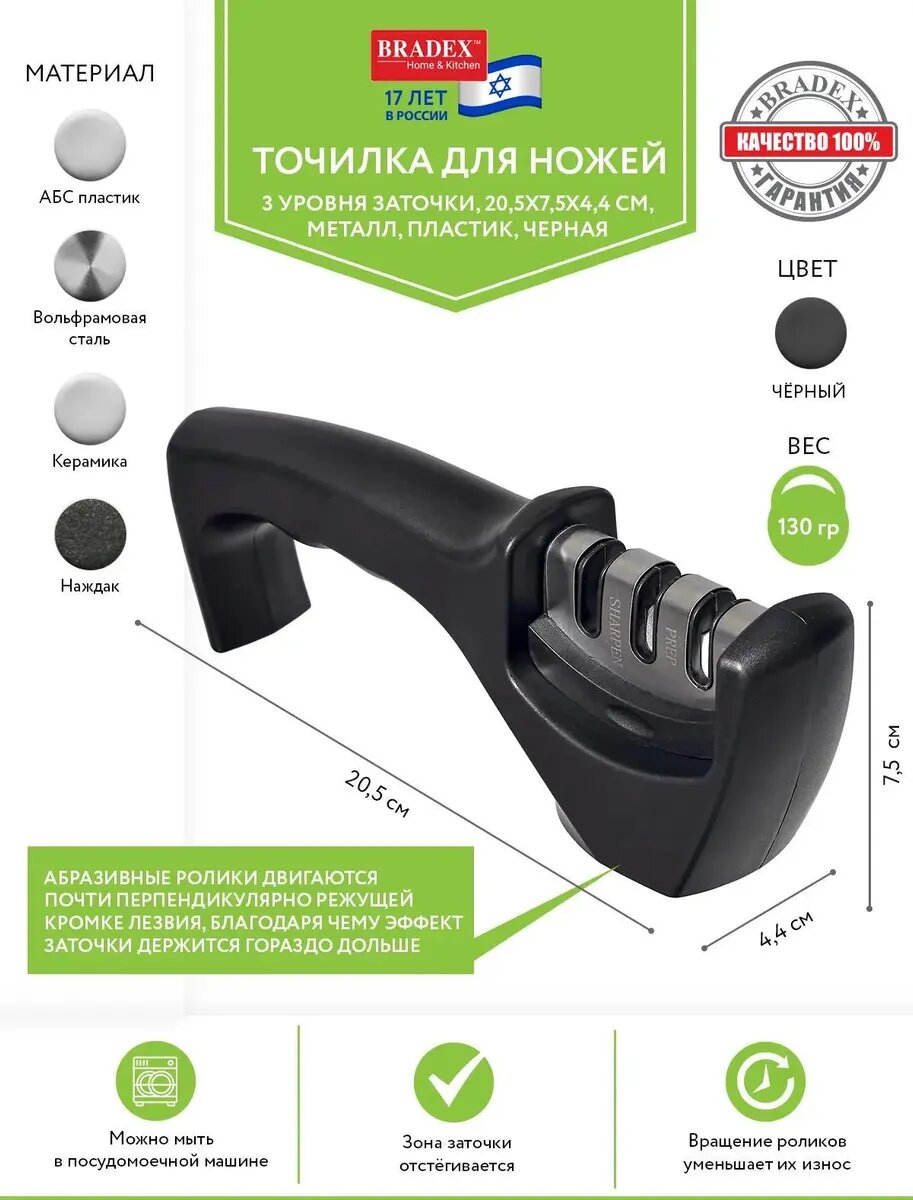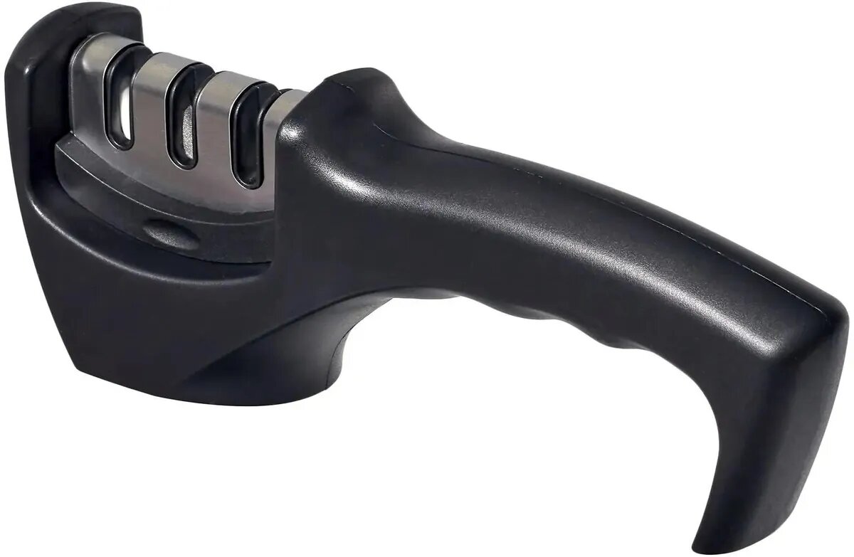 Точилка подходит для кухонных ножей из стали с прямой кромкой, включая ножи с лезвиями из закаленной стали. Абразивные ролики двигаются почти перпендикулярно режущей кромке лезвия, а не вдоль, как в точилках с неподвижными камнями, благодаря чему эффект заточки держится гораздо дольше.