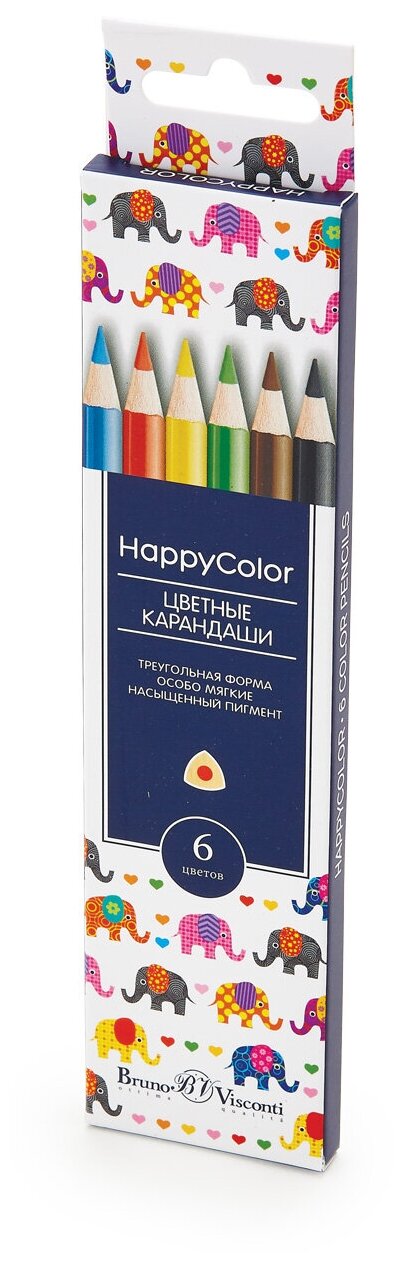 Набор цветных карандашей трехгранной формы серии HappyColor бренда BrunoVisconti®. Упаковка 6 цветов. Карандаши выполнены в трехгранном корпусе из термообработанной липы. Грифель категории А состоит из высококачественных пигментов ярких оттенков. Вы получите удовольствие от работы с этими карандашами, у них мягкое скольжение грифеля и сочные цвета. Покрытие карандашей -лак на водной основе - это бережное отношение к окружающей среде и здоровью детей. Карандаши упакованы в картонную коробку. Представлены в шести разных дизайнах.