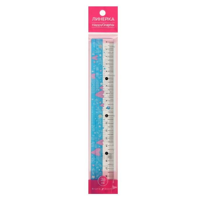 Пластиковая линейка с антискользящими вставками, длиной 20 см, из серии. "Happy Graphix". Изготовлена из полупрозрачного нетоксичного пластика. Украшена принтом из розовых сердец и единорогов на голубом фоне. Прозрачная шкала с разметкой и цифрами расположена по верхней грани линейки. Есть фаска. Это помогает ребенку аккуратно и точно прикладывать линейку. Риски шкалы нанесены тиснением и не сотрутся. Углы закруглены для безопасности использования. В стандартной упаковке 24 шт. в индивидуальных пакетах с европодвесом.