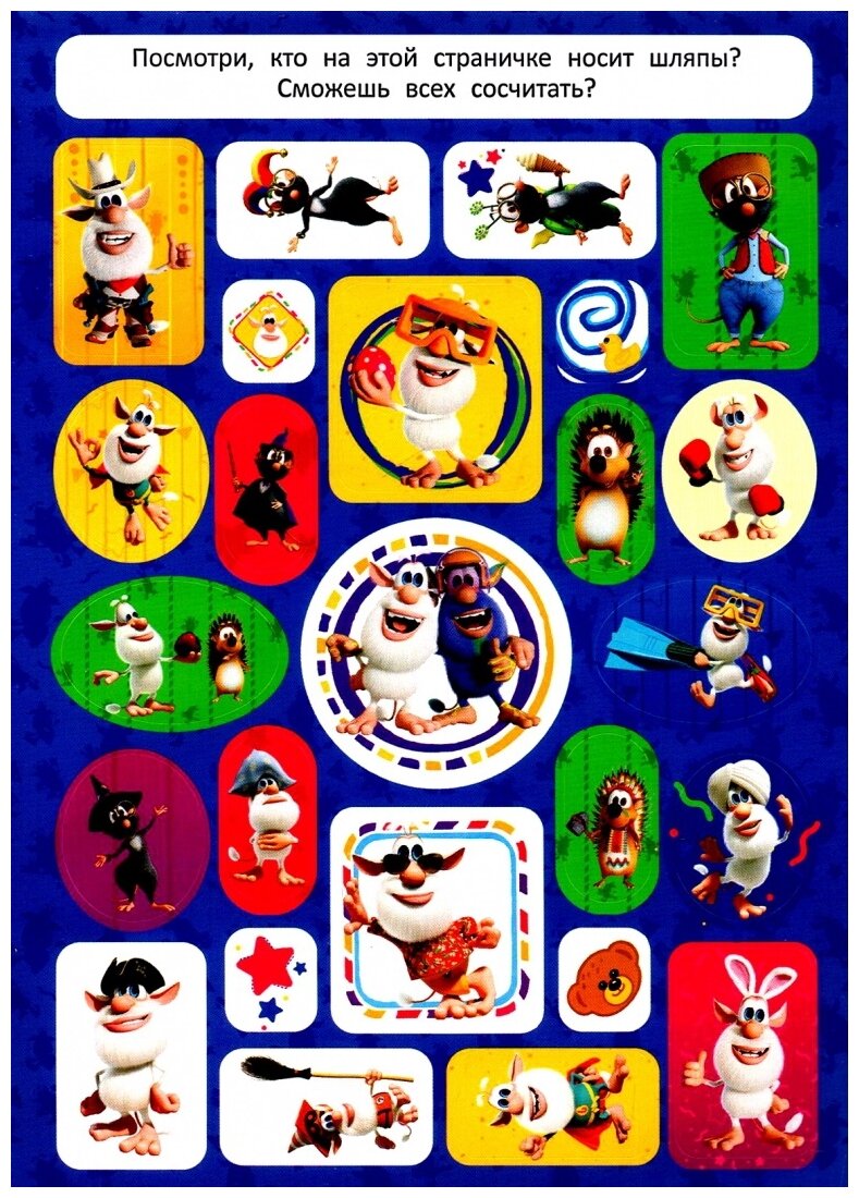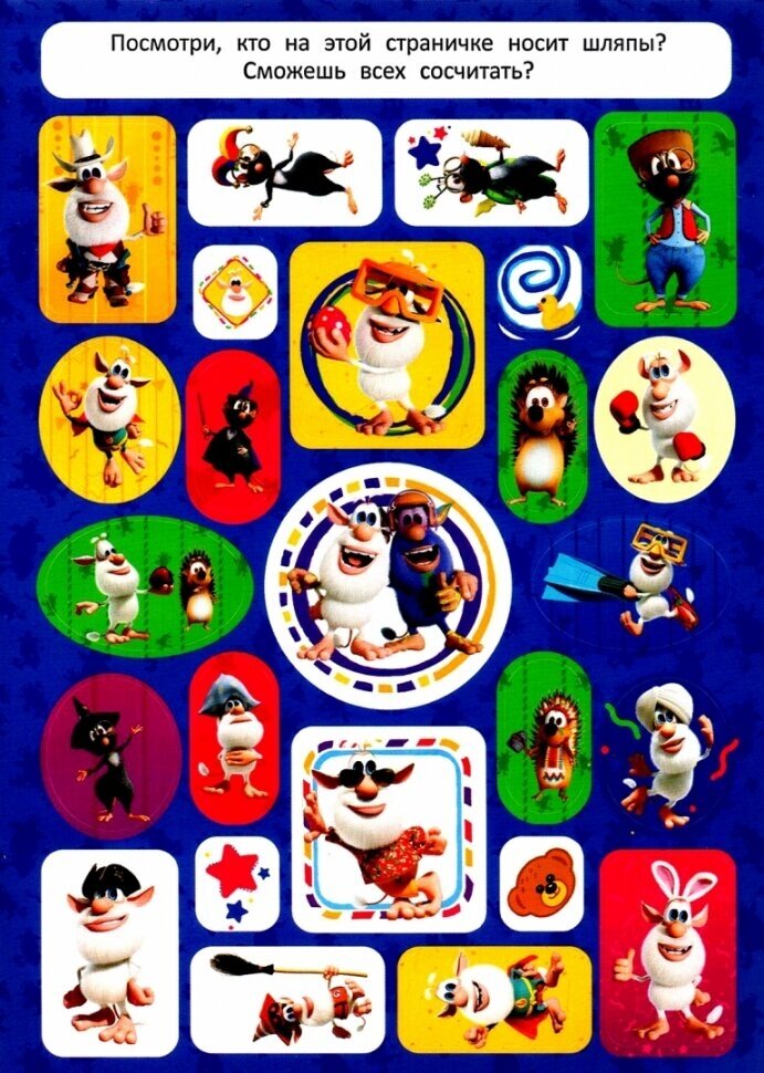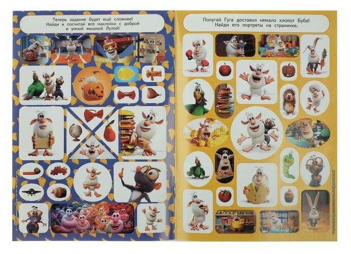 4 разворота с наклейками. Только одни наклейки, небольшие задания на каждом развороте и всё. Сын очень любит Бубу поэтому с удовольствием клеили в обычный альбом. Наклейки в основном небольшие, в центре только крупнее.