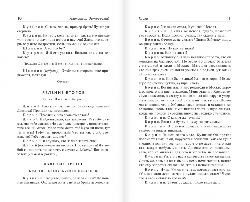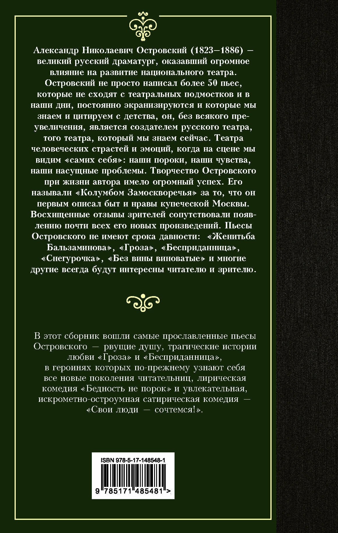 Это издание наиболее бюджетное,оно в твердой обложке,страницы не самые белые,но достаточно приемлемые,а шрифт средний. Кроме того,цена на него очень приятная,а смотрится оно прилично. Произведения Островского имеют нечто схожее между собой-это грустные события и трагический финал. Невозможно не сочувствовать судьбам персонажей,этим и цепляют данные пьесы