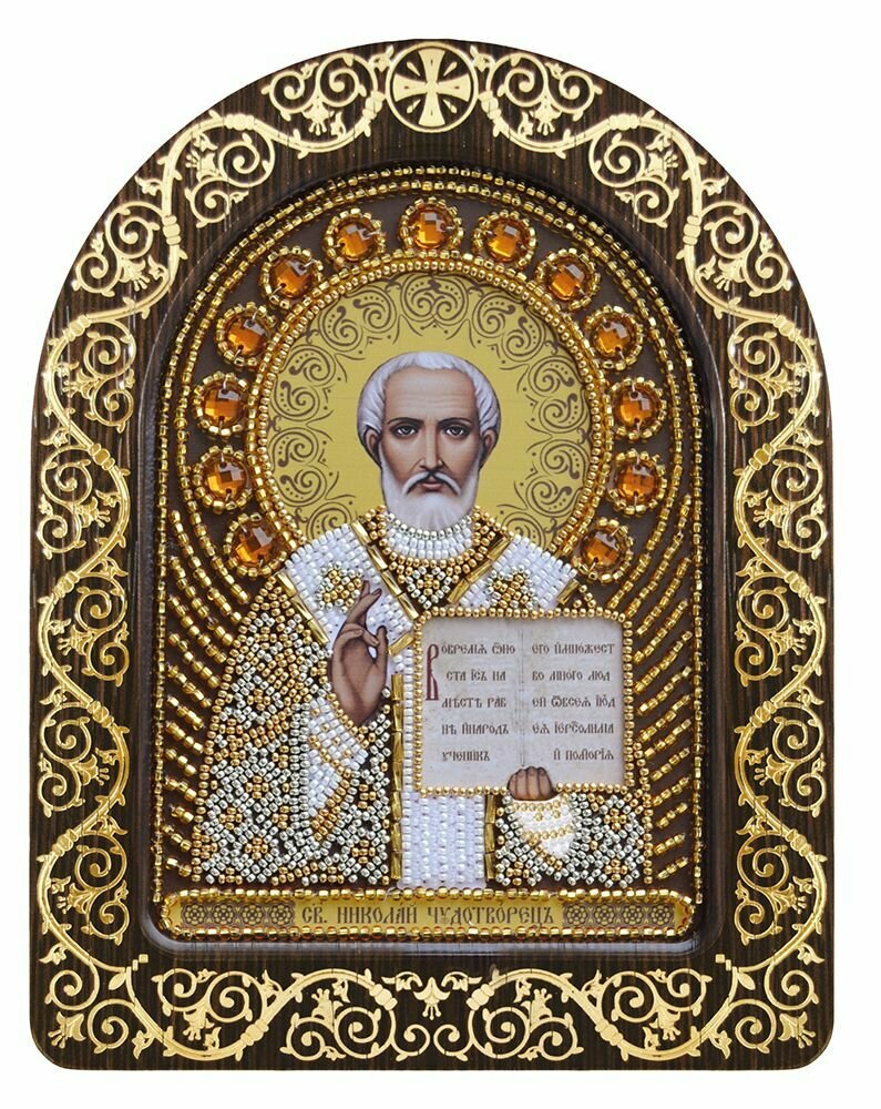 Бисер – традиционный материал для украшения икон. Его ценят за яркий блеск, многообразие цветовой палитры, долговечность. Икона "Св. Николай Чудотворец", украшенная бисером, займет почетное место в вашем домашнем иконостасе или станет прекрасным подарком верующему человеку. Пяльцы и рамки для вышивания не потребуются – твердая основа с перфорацией отлично держит форму. Фигурная рамка придает иконе торжественность и завершенность. В наборе: пластик с перфорацией и фоновым рисунком, бисер Preciosa – 1 цвет, бисер MIYUKI №15 – 4 цвета, камни, стеклярус, фигурная рамка, игла, нить для вышивания бисером, схема, инструкция.