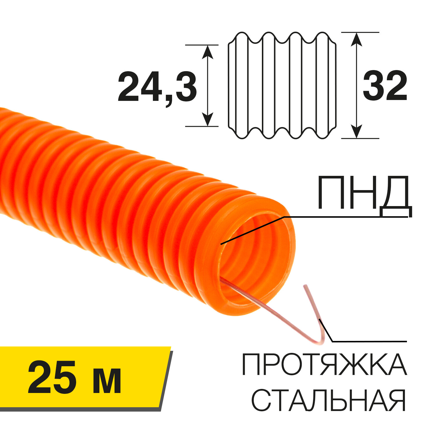 Гофрированная труба диаметром 32 мм используется для прокладки слаботочных и силовых электросетей, эксплуатируемых при напряжении переменного тока величиной до 1000 В, а также при прокладке компьютерных, телевизионных, телефонных и IT-сетей и коммуникаций. Применяется для прокладки электропроводки открытым или скрытым способом по полам и стенам жилых, общественных и производственных зданий, а также в грунте. Подходит для защиты изолированных проводов и кабелей от механических повреждений и агрессивного воздействия окружающей среды при прокладке сложных систем и трасс.Рельефная конструкция трубы обеспечивает легкость монтажа, позволяет трубе выдерживать высокие нагрузки и предотвращает деформацию при изгибе.Наличие специальной металлической проволоки – зонда, позволяет быстро и легко прокладывать кабели и провода внутри трубы. Труба изготовлена из ПНД (полиэтилена низкого давления), благодаря чему отличается высокой коррозионной и химической стойкостью, повышенной морозостойкостью, устойчивостью к воздействию влаги и механическим нагрузкам.Длина трубы – 25 м, цвет – оранжевый.
