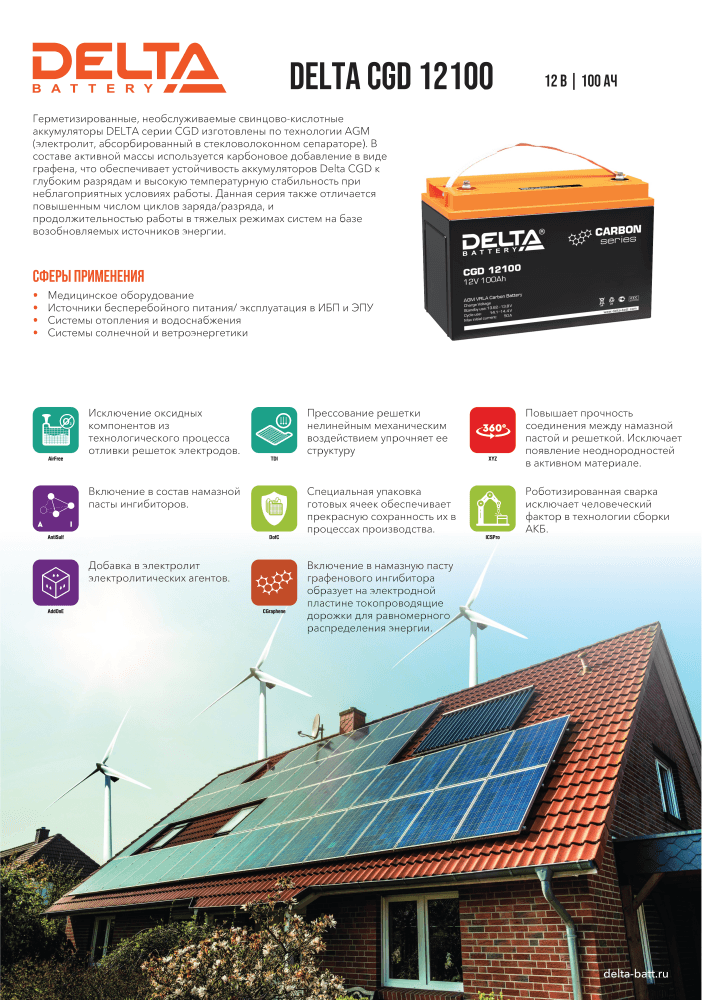 Герметизированные, необслуживаемые свинцово-кислотные аккумуляторы DELTA серии CGD изготовлены по технологии AGM. В составе активной массы используется карбоновое добавление в виде графена, что обеспечивает устойчивость аккумуляторов Delta CGD к глубоким разрядам и высокую температурную стабильность при неблагоприятных условиях работы.