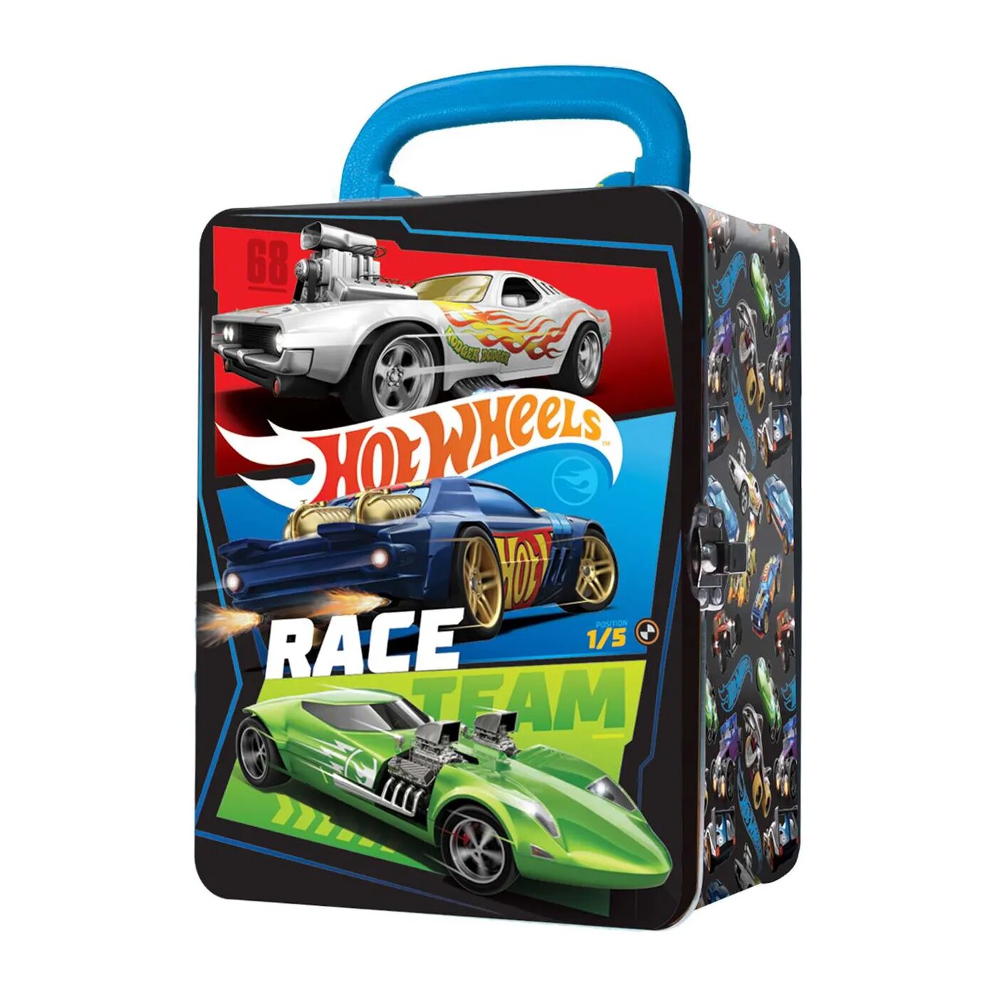 Прочная, яркая металлическая коробка с рельефным изображением машинок HotWheels на лицевой части.