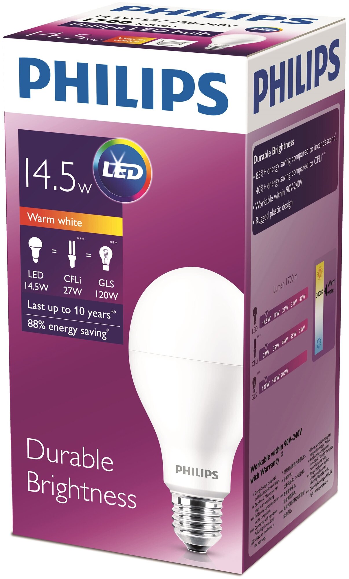 Лампа светодиодная 14.5W E27 3000k теплый белыйЛампа светодиодная Philips, А 145Вт E27 3000К 1700Лм 240В. Лампа светодиодная от известного бренда Philips излучает теплый белый свет, что позволяет организму человека воспринимать такой свет как сигнал к успокоению. Также лампа такого светового диапазона способствует к мягкому пробуждению по утрам. Чаще всего применяется для создания уюта в местах отдыха. Мягкий теплый свет создаст приятную атмосферу для времяпровождения. Преимущества: Возможность разностороннего применения товара (как бытового, так и производственного); Мягкий рассеивающий свет; Распространенный цоколь типа E27; Работает от стандартного напряжения; Матированная стеклянная колба. Внешний вид и\или характеристики товара могут быть изменены производителем в соответствии с производственным процессом.