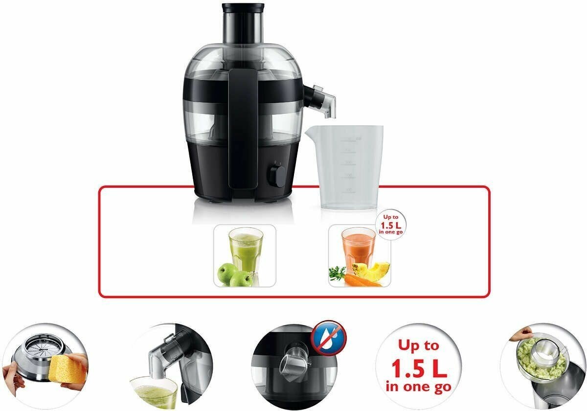 Соковыжималка центробежная Philips 500 Вт Black - надежный помощник при приготовлении свежего и полезного сока. Ее компактный размер не займет много места на вашей кухне, а ее черный цвет подчеркнет стиль вашего интерьера. Благодаря механическому управлению, вы всегда будете контролировать процесс приготовления сока. Объем резервуара для сока составляет 500 мл, что позволяет приготовить достаточно сока за один раз. А объем резервуара для мякоти равен 1000 мл, что гарантирует чистый и непрерывный процесс отделения сока от мякоти.