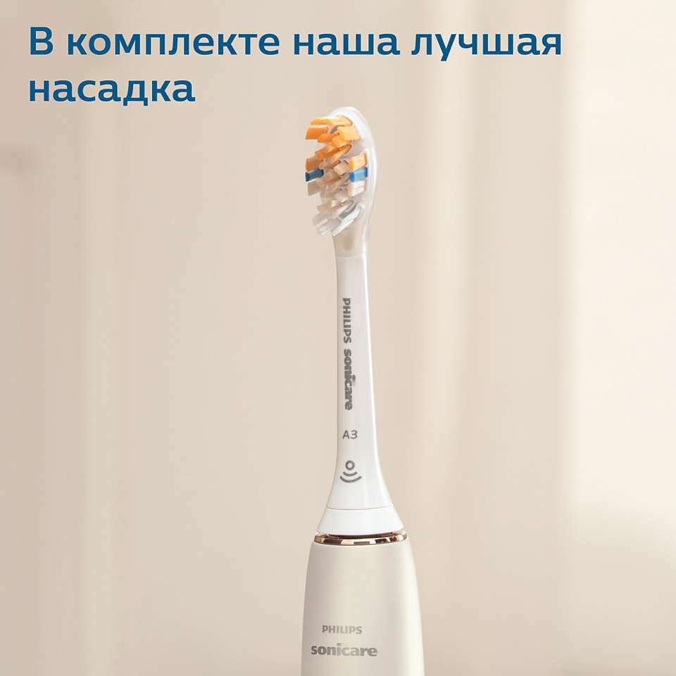 | Комплектация (воз-ны изменения в разных поставках) | USB-кабель, База для зарядки, Премиальный зарядный футляр USB, Ручка зубной щетки, Универсальная насадка Philips Sonicare A3 Premium |