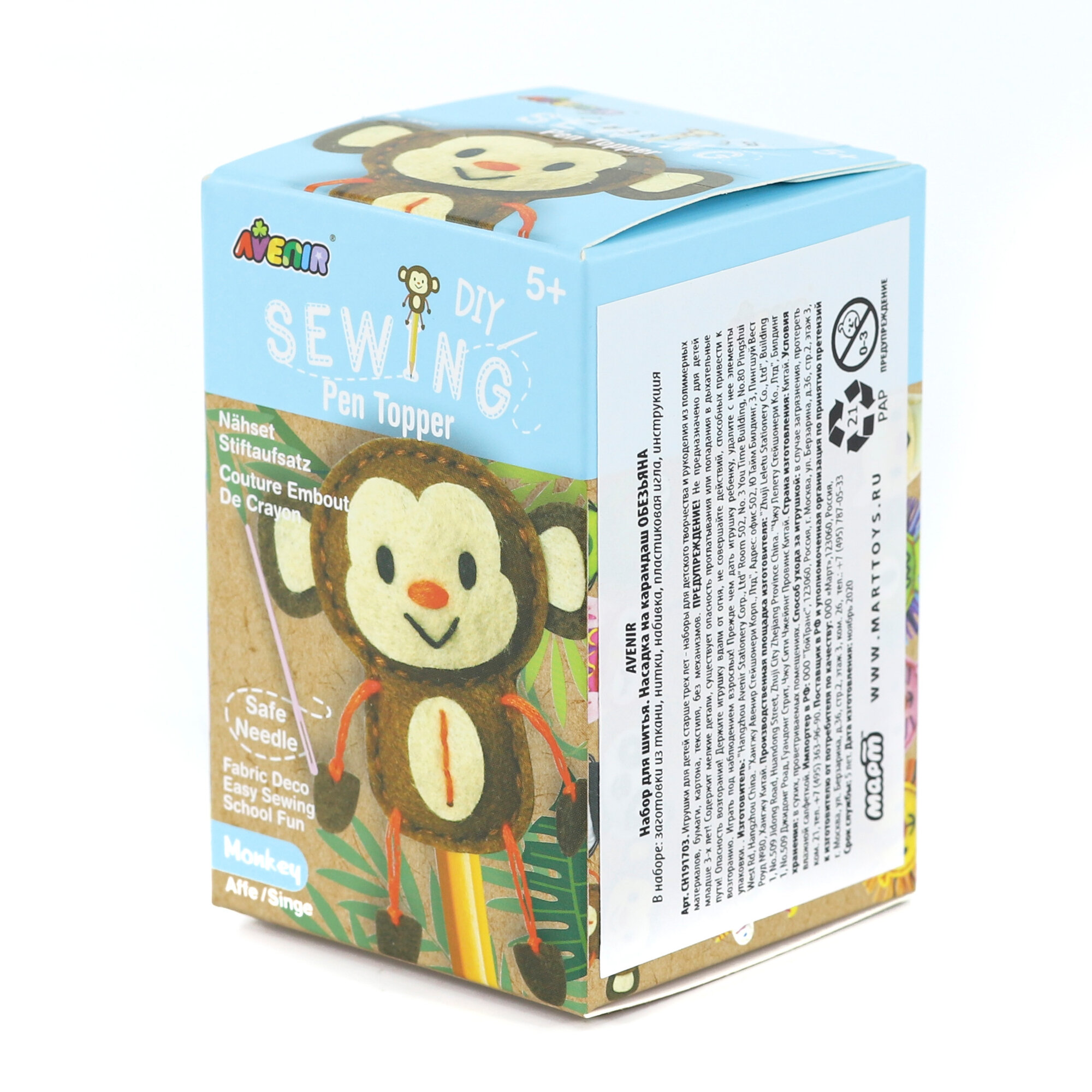 Набор для шитья насадки на ручку или карандаш Обезьяна от бренда Avenir - это отличное погружение в мир шитья с яркими и веселыми персонажами. Дети полюбят самостоятельно создавать маленьких питомцев. Для этого достаточно лишь следовать простым иллюстрированным инструкциям, которые научат разным методам шитья.