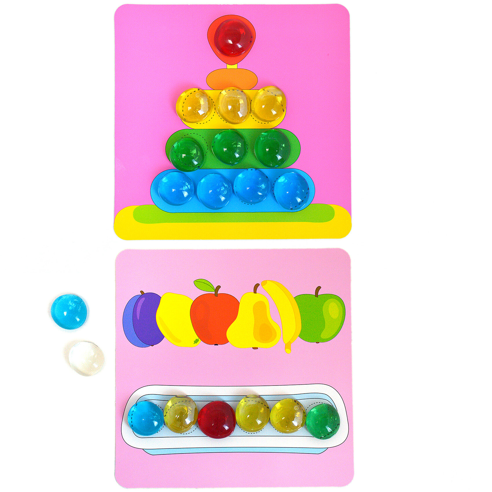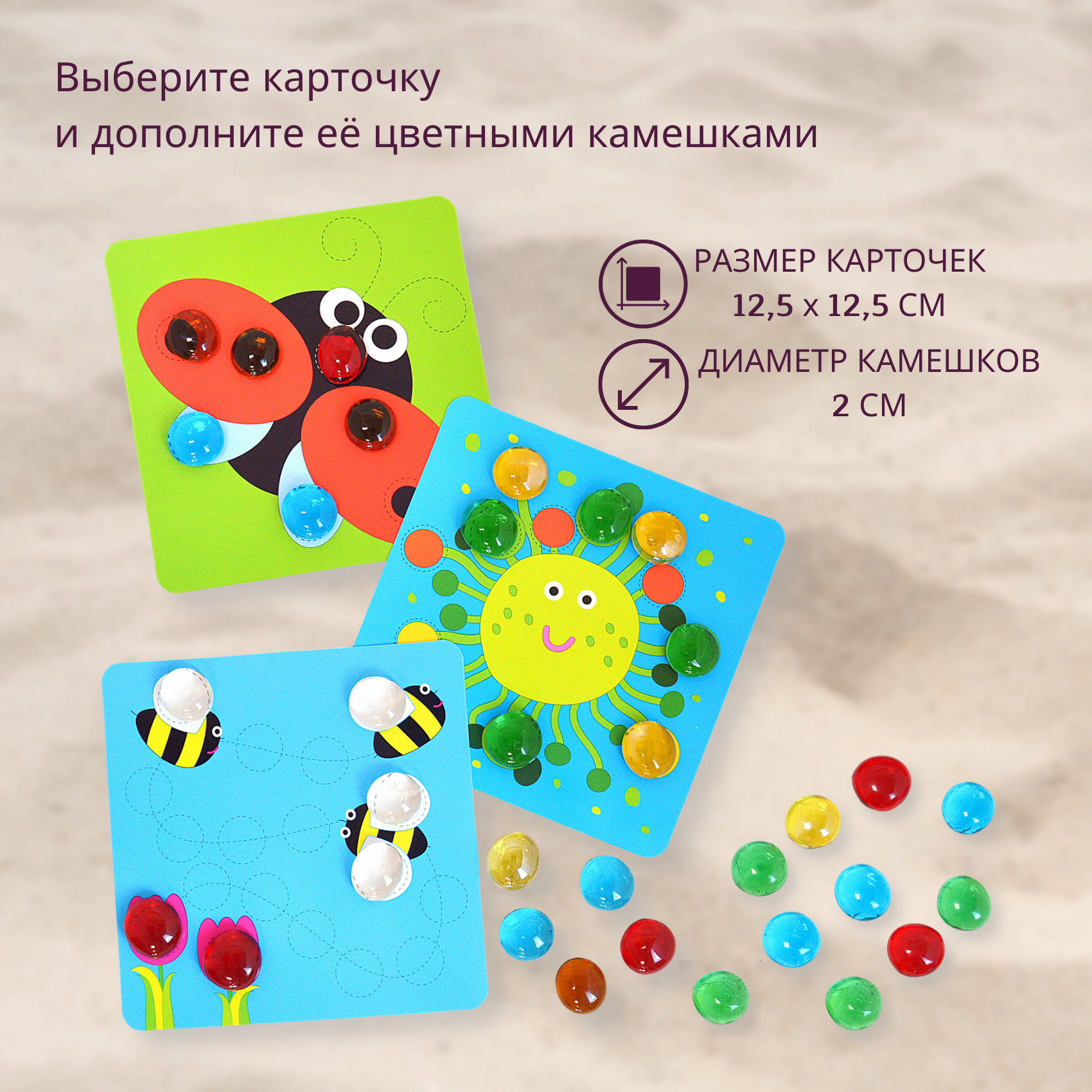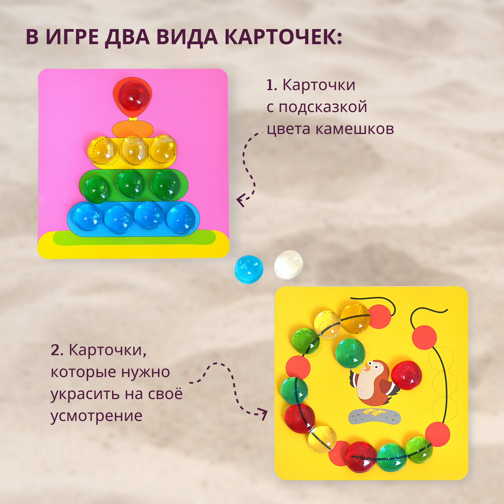 В коробке вы найдёте камешки шести цветов и карточки с яркими детскими рисунками. Задание понятно ребёнку интуитивно - нужно дополнить картинки. Есть карточки, на которых цвет камешков «подсказан», и те, которые нужно украсить на своё усмотрение.