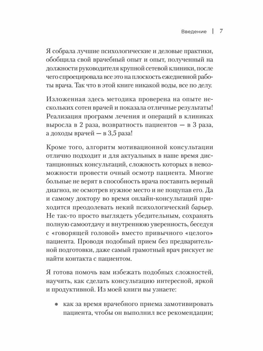 Ни для кого не секрет, что медицина является одной из важных и сложных профессий. На медицинское образование люди тратят много лет, а студенты меда считаются самыми трудолюбивыми. Однако на изучение теории и практики накладывается так же способность коммуникации, и этот фактор не является последним, все три идут вровень. Для того, чтобы действительно вылечить пациента, он должен вам доверять, когда это все сопровождается еще и страхом за свое здоровье, а то и вовсе истерией, все может стать сложнее. В книге большой раздел уделяется именно грамотному общению с пациентом. Не смотря на ограниченное время медика и морально сложную ношу, состояние пациента - работа, и к нему нужно относиться внимательно. Как объясняет автор, консультация с пациентом - первый шаг к успеху, он настолько важен, что автор предлагает подробный алгоритм мотивационного консультирования клиента, расписывая каждый момент и каждую ошибку. Однако так же в книге уделили внимание монетизации. Да, издревле врач - лекарь, который положил свою жизнь на то, чтобы лечить людей, однако медик - такой же человек, которому для жизни нужен заработок, и его стремление к большему - его право, а для этого изначально нужно задать себе цель, о чем так же рассказывает автор книги.