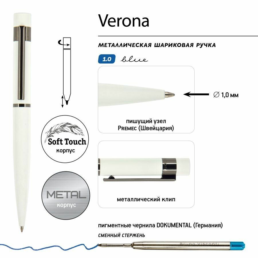 Белая классическая ручка в графичном дизайне из коллекции Verona. Это автоматическая шариковая ручка с качественными пигментными чернилами синего цвета. Металлический корпус ручки нескользящий, мягкий и теплый на ощупь благодаря резиновому напылению Soft Touch. Контраст добавляют кольцо и клип из глянцевого темного металла. Толщина линии письма 0,7 мм. Удачный вариант подарка консервативному человеку, хороший бизнес-сувенир. Готова к персонализации.