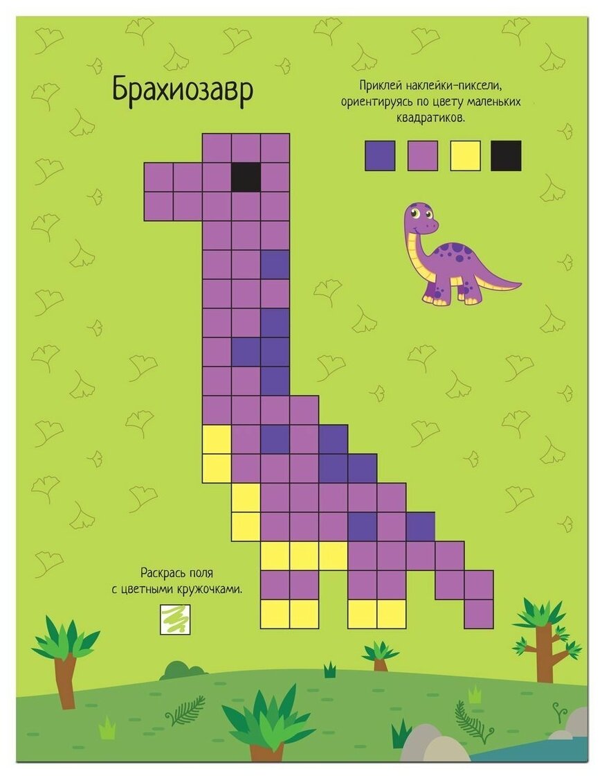 В книге «Динозавры» серии «Пиксели. Клеим и рисуем» ребенку предстоит составлять картинки по образцу из наклеек-пикселей. В книге их 780 штук! Как по волшебству, на пустой страничке появятся изображения разных динозавров. А еще нужно будет вооружиться цветными карандашами и выполнить разнообразные задания с пикселями: дорисовать картинку зеркально, по образцу или по легенде, а также продолжить ряды.