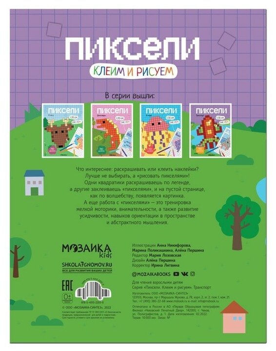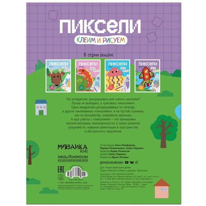 В книге «Транспорт» серии «Пиксели. Клеим и рисуем» ребенку предстоит составлять картинки по образцу из наклеек-пикселей. В книге их 780 штук! Как по волшебству, на пустой страничке появятся изображения разных видов транспорта. А еще нужно будет вооружиться цветными карандашами и выполнить разнообразные задания с пикселями: дорисовать картинку зеркально, по образцу или по легенде, а также продолжить ряды. Задачки с пикселями - это отличная тренировка мелкой моторики, абстрактного мышления и координации движений. А еще это увлекательное времяпровождение для детей и даже взрослых.