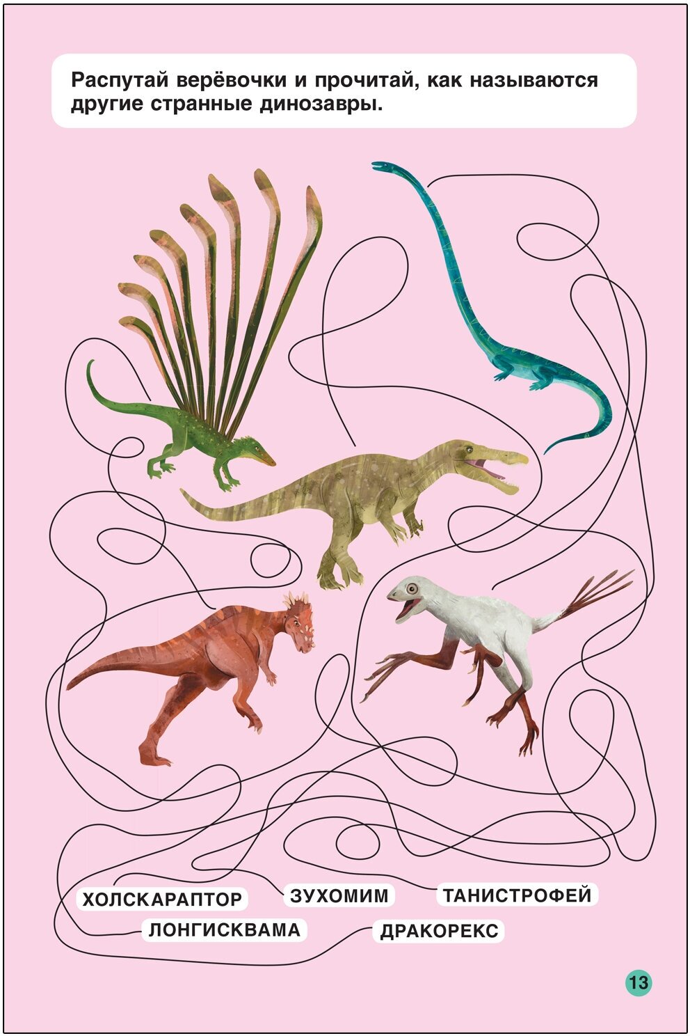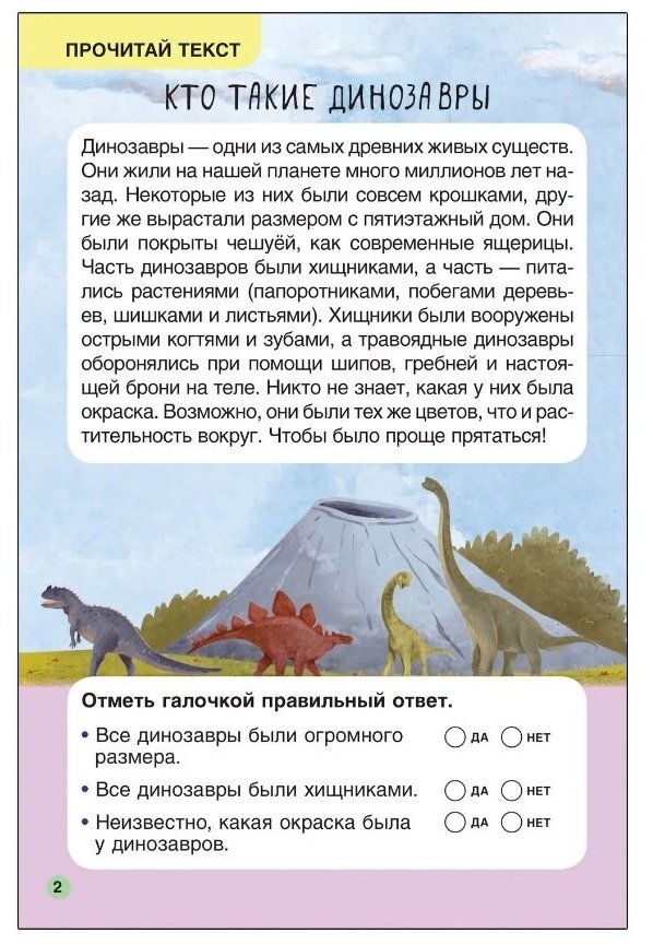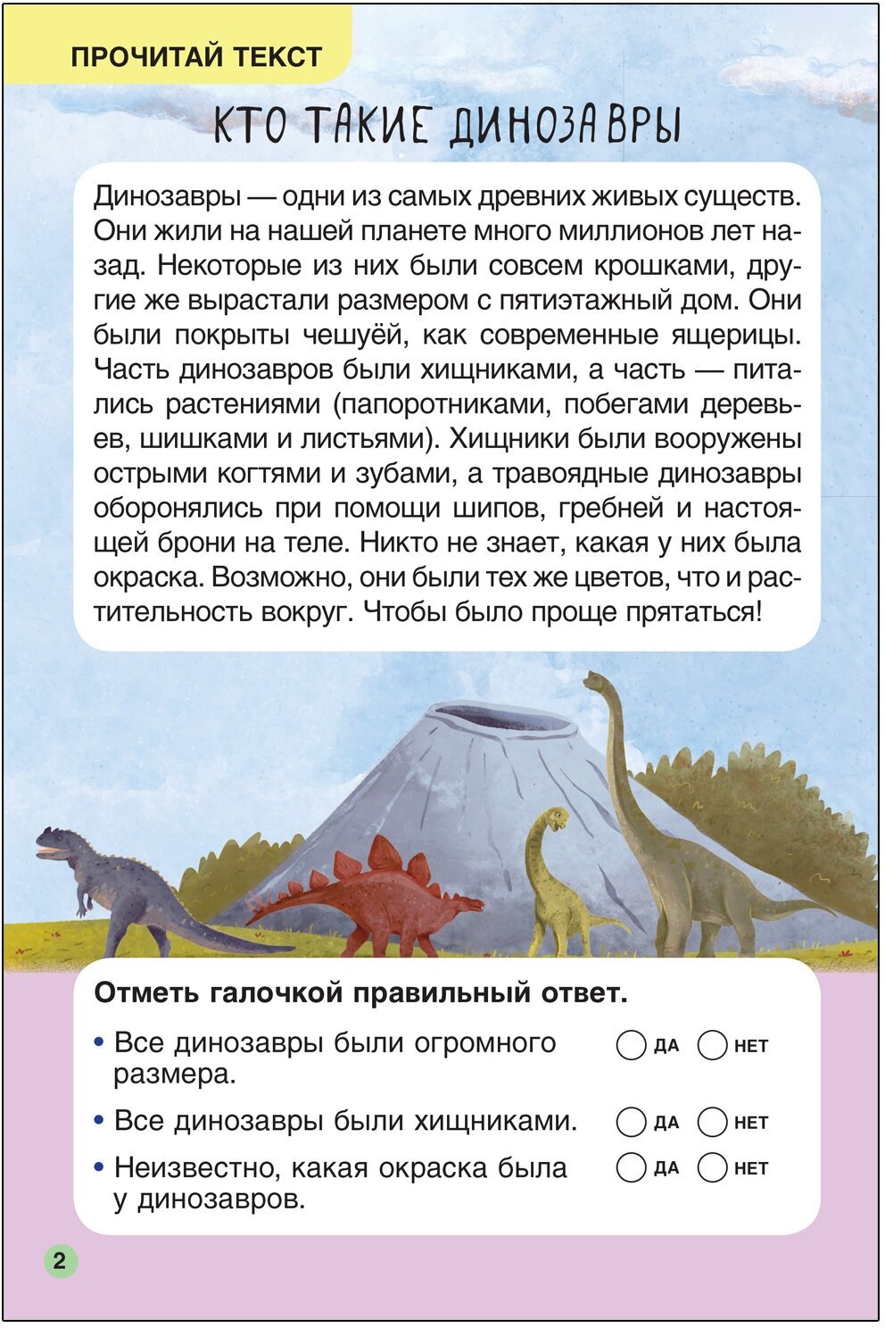 Ребенок познакомится с самыми необычными ящерами и любопытными фактами о доисторической эпохе, а реалистичные иллюстрации помогут погрузиться в удивительный мир динозавров. К каждому тексту прилагаются вопросы на понимание, а также разноплановые задания. Все тексты написаны специально для первого чтения. Благодаря крупному шрифту и небольшому объему и тексты, и задания ребенок сможет прочитать самостоятельно.