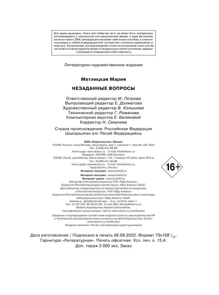 Книга: Незаданные вопросы (Метлицкая Мария); ООО "Издательство "Эксмо", 2022
