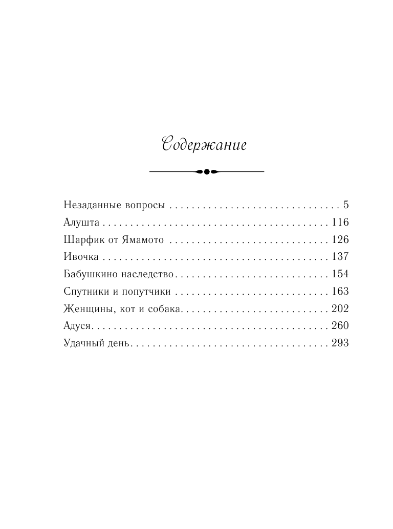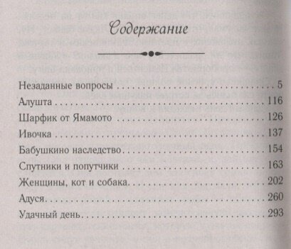Кроме повести «Незаданные вопросы» в сборник вошло еще семь рассказов: «Алушта», «Адуся», «Женщины, кот и собака», «Шарфик от Ямамото» и другие. Это самостоятельные произведения, которые можно читать в любом порядке.