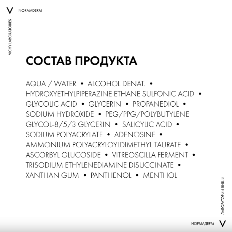 | Состав | Aqua-water-eau, alcohol denat., hydroxyethylpiperazine ethane sulfonic acid, glycolic acid, glycerin, propanediol, sodium hydroxide, peg-ppg-polybutylene glycol-8-5-3 glycerin, salicylic acid, sodium polyacrylate, adenosine, ammonium polyacryloyldimethyl taurate, ascorbyl glucoside, vitreoscilla ferment, trisodium ethylenediamine disuccinate, xanthan gum, panthenol, menthol |