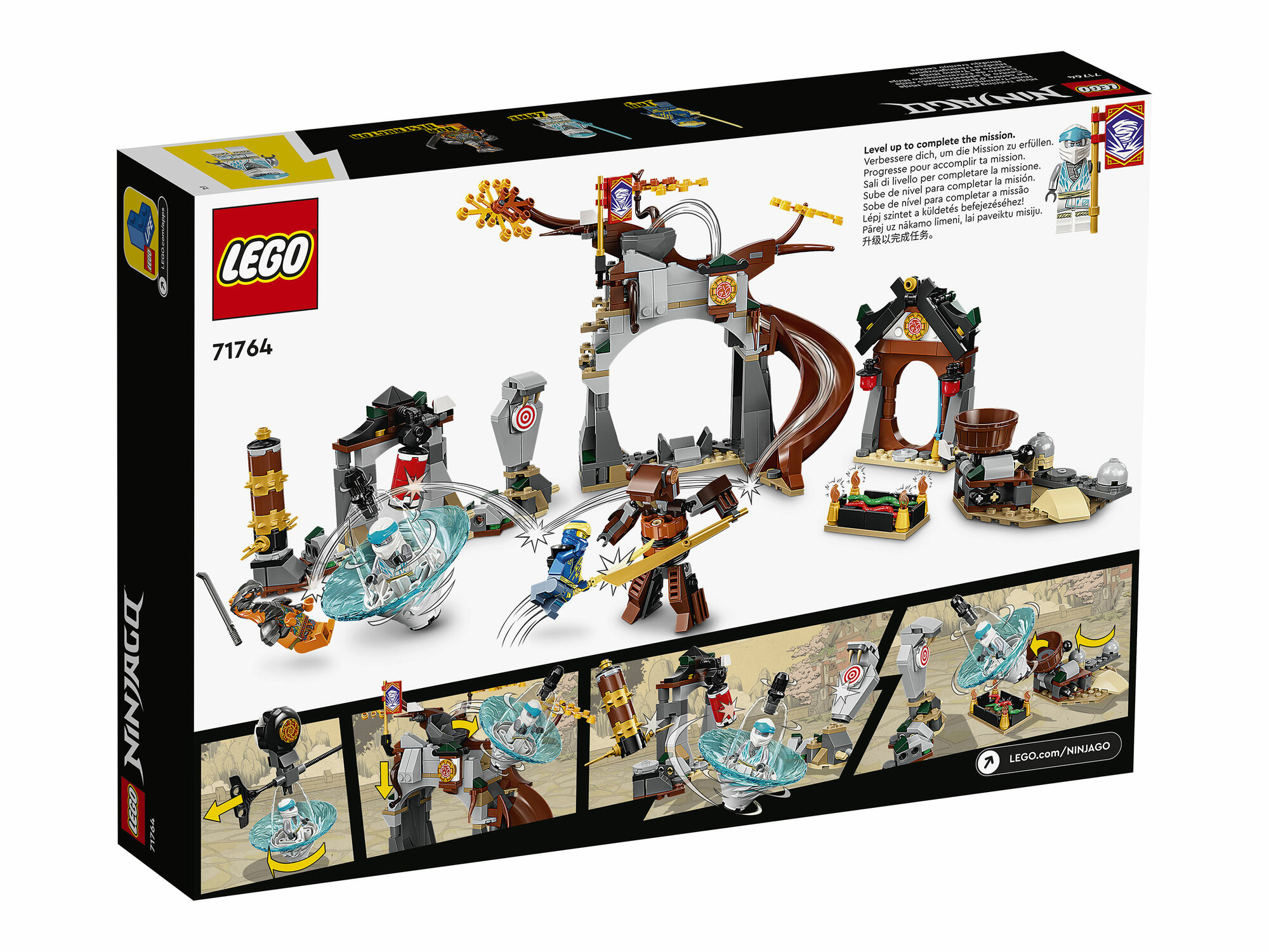 - Интерактивный игровой набор — дети могут обучать своих героев-ниндзя с помощью спиннера в полном приключений тренировочном центре ниндзя LEGO® NINJAGO® (71764), проходя серию испытаний.