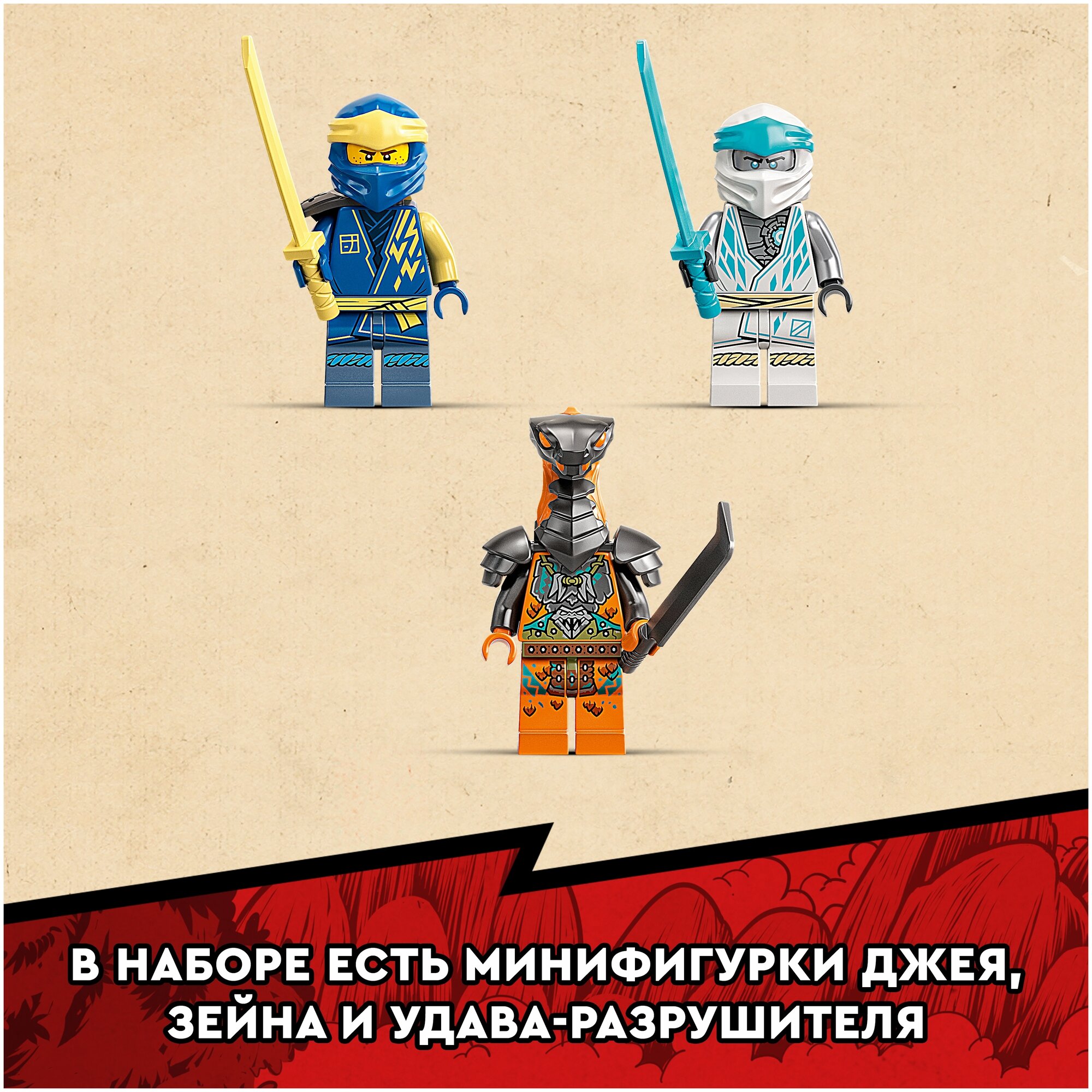- Три минифигурки — игровой набор включает в себя Зейна и Джея с мечами, а также Удава-разрушителя с его собственным большим мечом, чтобы дети могли разыгрывать напряжённые битвы.