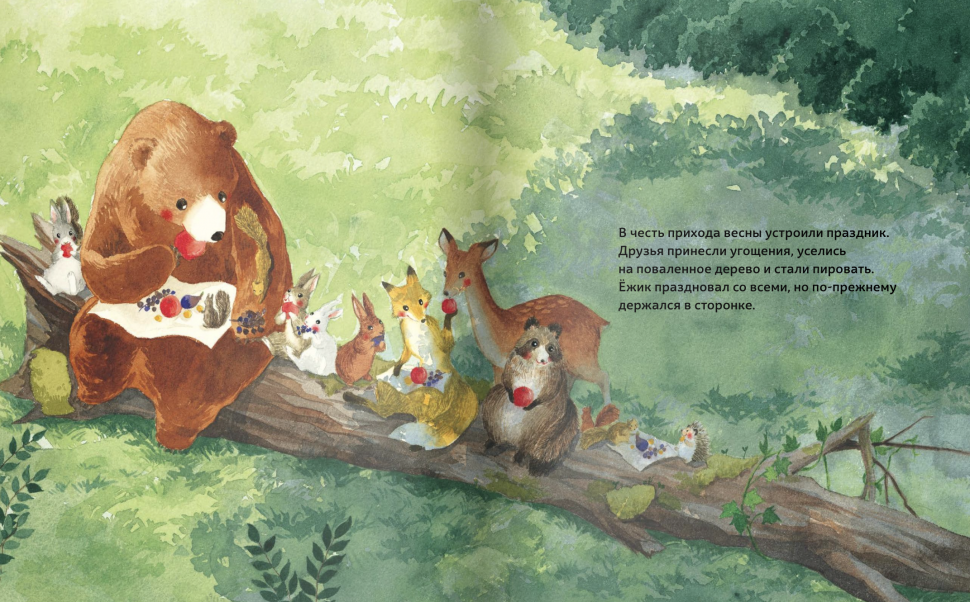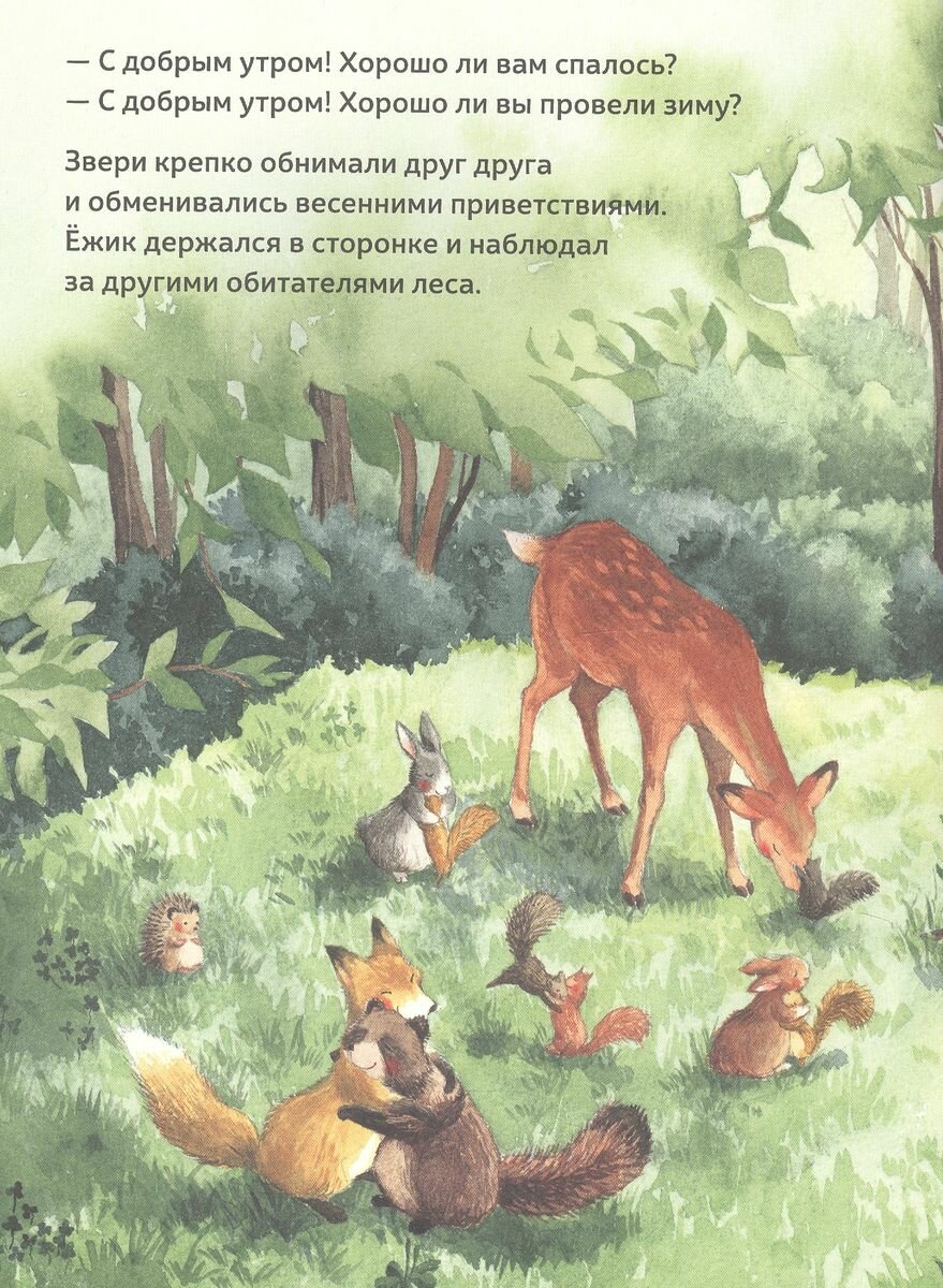 Как же хочется обнять друзей после долгой зимы! Но иголки ёжика такие острые, что малышу приходится держаться в сторонке.