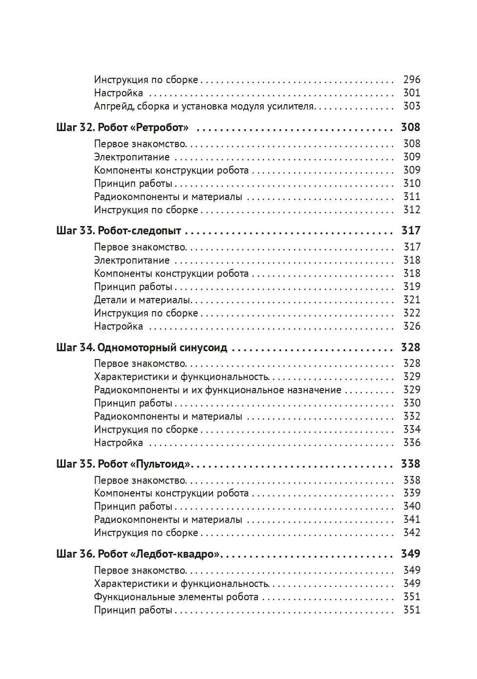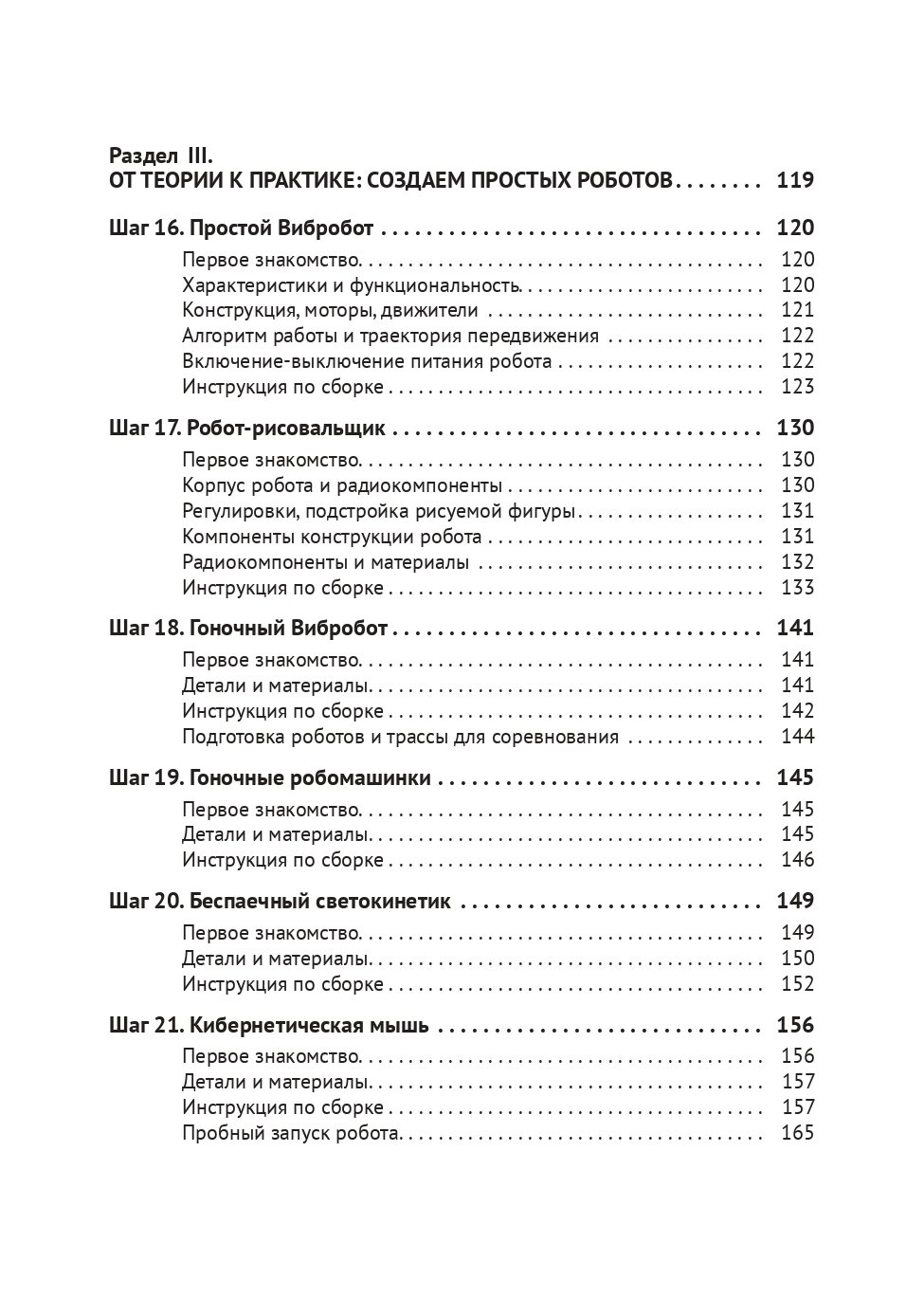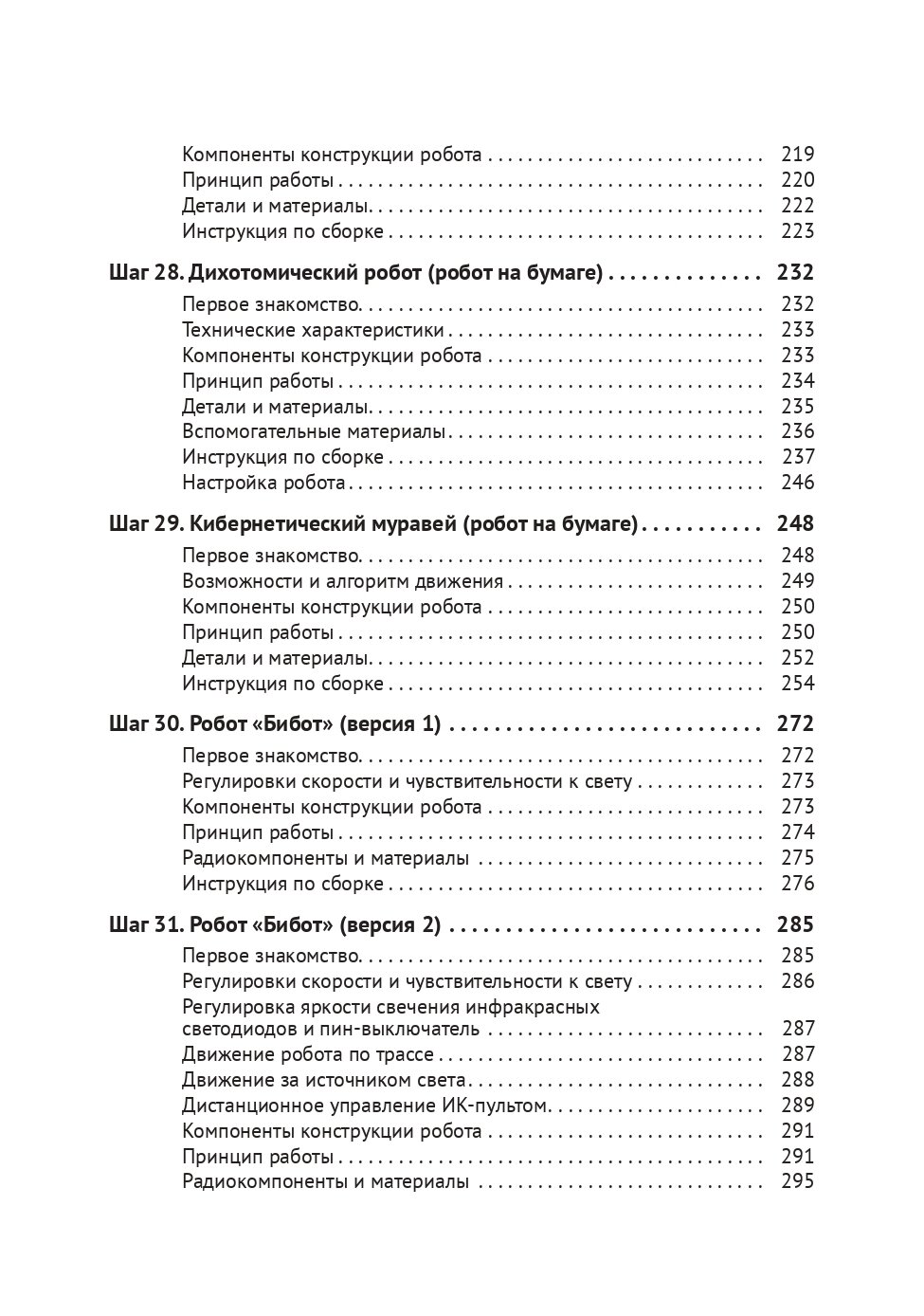 Представлены 35 практических конструкций роботов. Освоению процесса создания роботов помогут сотни иллюстраций. В теоретической части к каждому проекту дается точное описание электрических процессов для полного понимания того, как работает схема робота. В практической части каждого проекта показана последовательность монтажа/сборки и настройки работающей модели. Книга представляет образовательную программу для кружков робототехники. Книга предназначена для широкого круга читателей: от школьников до студентов, радиолюбителей или просто увлеченных радиотехническим творчеством людей.