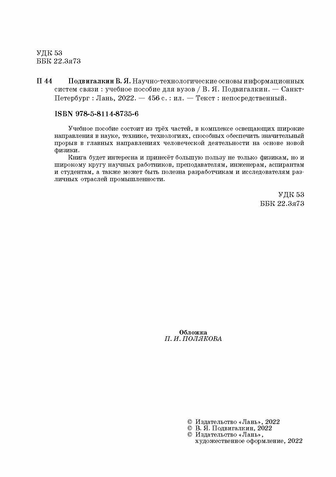 Научно-технологические основы информационных систем связи учебное пособие для вузов (В. Я. Подвигалкин); Издательство ЛАНЬ, 2022