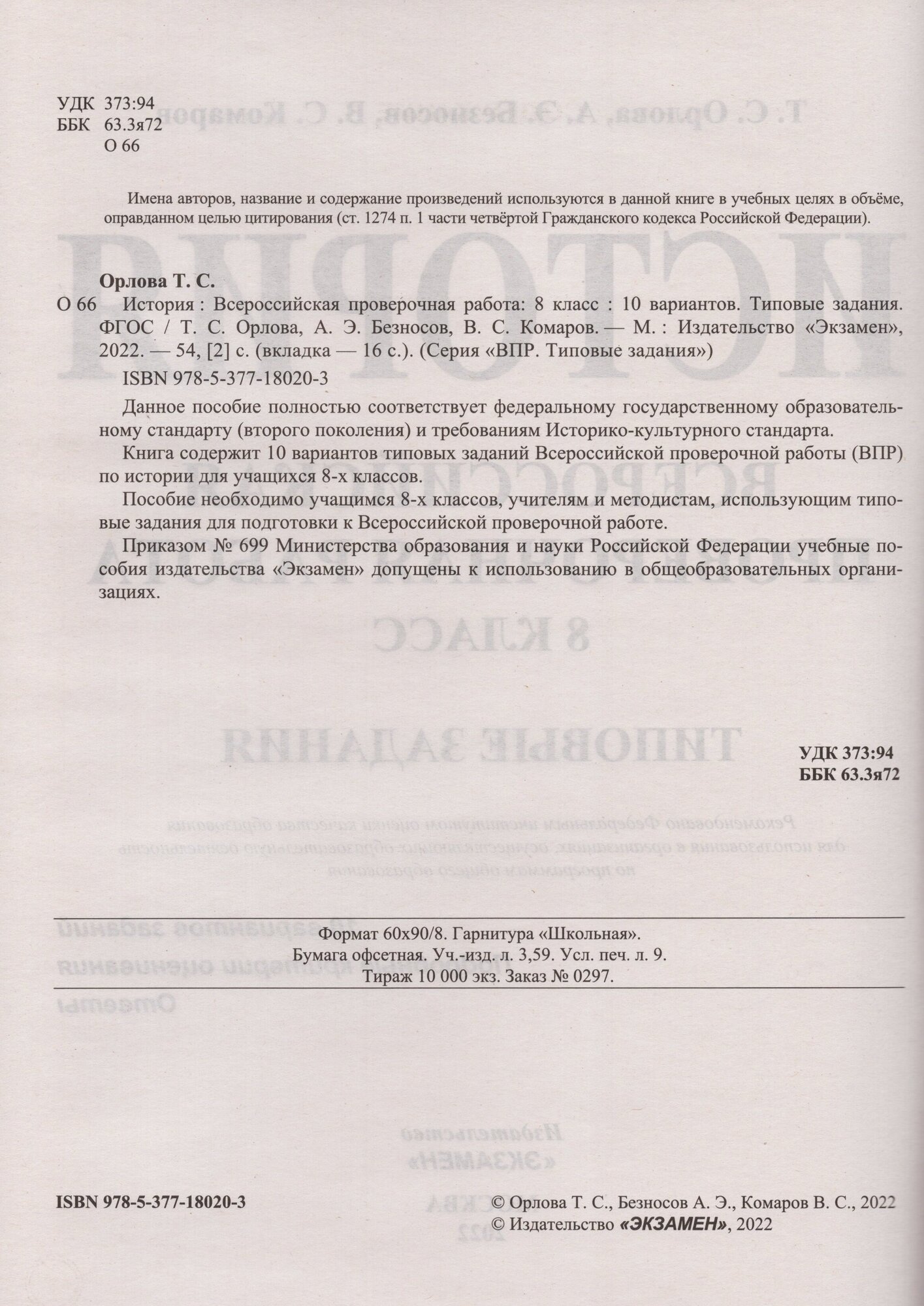 История Всероссийская проверочная работа 8 класс Типовые задания 10 вариантов заданий Подробные критерии оценивания Ответы (Орлова Татьяна Сергеевна; Комаров Владимир Сергеевич; Безносов Александр Эдуардович); Экзамен, 2022