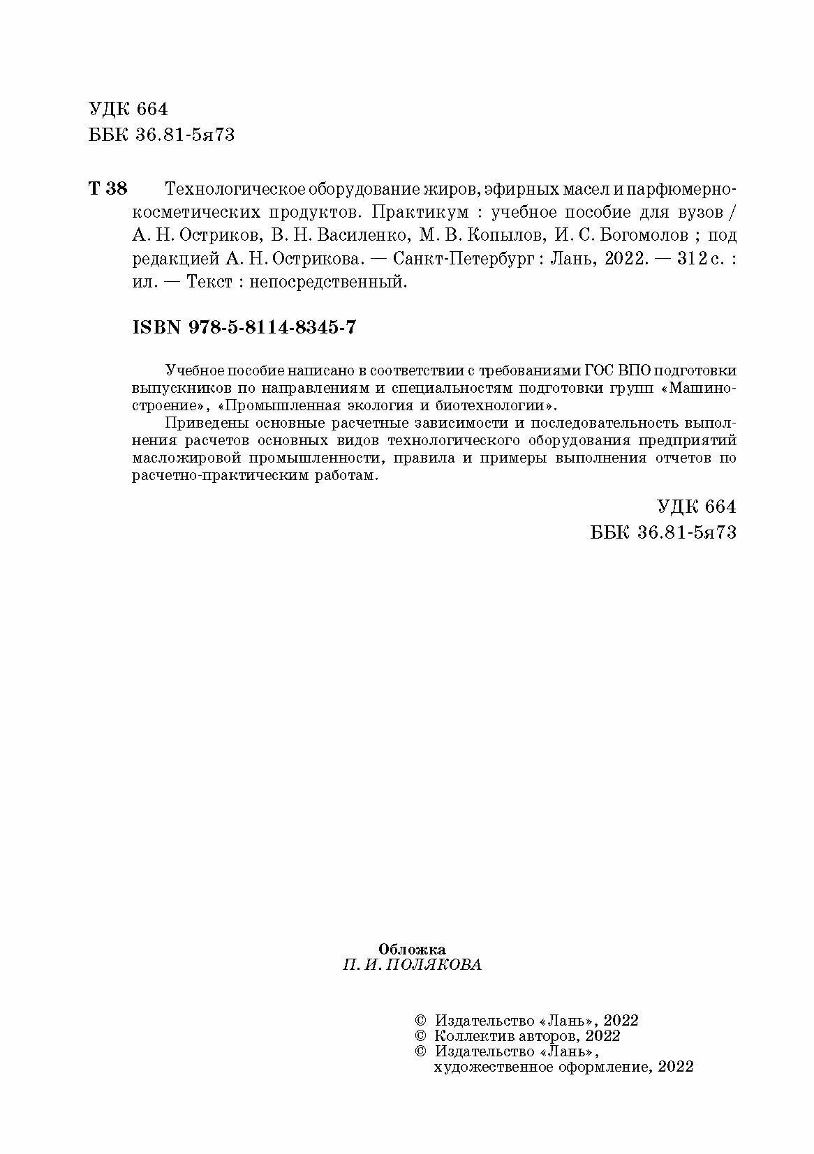 Технологическое оборудование жиров эфирных масел и парфюмерно-косметических продуктов Практикум учебное пособие для вузов (Остриков Александр Николаевич, Василенко Виталий Николаевич, Копылов Максим Васильевич); Лань, 2022