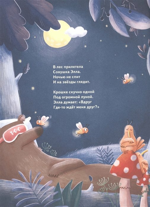 Эта трогательная и мелодичная история в стихах успокоит малыша и сможет заменить ему мамину колыбельную перед сном. В лес прилетела маленькая и добрая совушка Элла. Днём она сладко спит, а ночью любуется на звёзды и круглую луну. Но ей так хочется с кем-нибудь подружиться! Кто же станет ей другом? Корова, чайка и лягушка с радостью готовы поиграть с совушкой! Только вот беда - днём Элла должна спать. Неужели бедняжка так и останется одна-одинёшенька?
