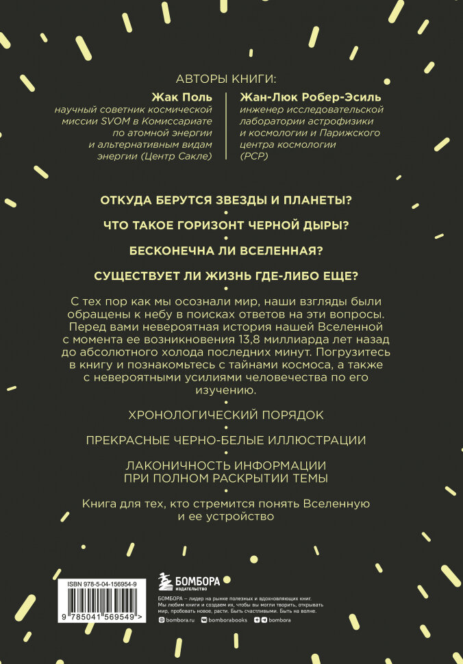 Эта книга, безусловно, заслуживает внимания всех любителей астрономии и естественных наук. Идея оригинальна - в коротких (на пару страниц) историях о примечательных событиях космического и/или земного масштаба рассказать об истории Вселенной от самого ее начала до далекого будущего. Авторам удалось четко следовать плану. Внутренняя логичность книги - одна из ее сильных сторон. Перед покупкой у меня были сомнения относительно того, не является ли эта книга совсем уж "детской". Однако взяв в руки и посмотрев первые страницы, эти сомнения оставил в стороне. Прочитав полностью, понимаю, что сомнения были напрасны. Книга подойдет и любителю (в т.ч. самого начального уровня), и профессионалу. Она именно научно-популярная (не строго научная, но и не совсем уж приземленно-популярная). Язык строгий, но понятный. Наличие у читателя элементарных знаний по астрономии, астрофизике, геологии, космогонии и физике будет в помощь, но и при значительной неполноте таковых читать книгу будет не так уж сложно. Важно, что книга отражает представления ученых по состоянию на самый конец 2010-х годов, т.е. она предлагает действительно свежий взгляд. Полнота проблематики отражена полностью. Можно узнать и такое, о чем не так часто узнаешь где-либо еще. На мой взгляд, советский/российский вклад в рассматриваемые научные проблемы заслуживает большего внимания, но все-таки он не игнорируется полностью.