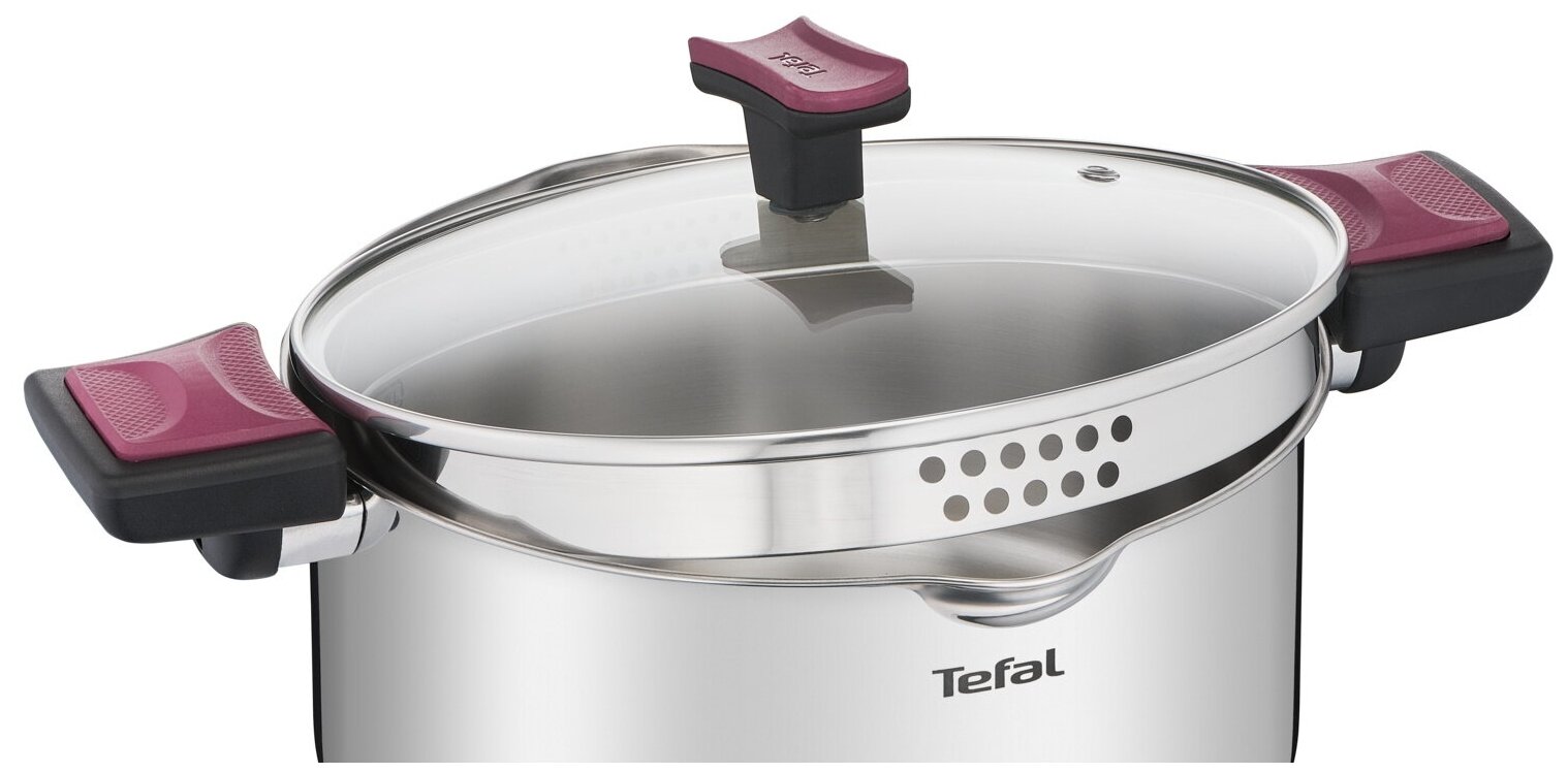 Высокая кастрюля Tefal Cook & Clip превращает приготовление блюд в увлекательный процесс и помогает экономить ваше время и электроэнергию. Приготовьте любимую пасту или рис, сварите овощи, фасоль и многое другое – инновационная крышка оснащена специальными отверстиями для слива жидкости без дуршлага и надежной системой блокировки, которая фиксирует ее непосредственно над носиками для слива. Посуда выполнена из высококачественной нержавеющей стали и оснащена индукционным дном, которое обеспечивает равномерный нагрев и качественное приготовление каждого блюда. Бакелитовые ручки не нагреваются во время приготовления и комфортно лежат в руке. Стеклянная крышка позволяет удобно наблюдать за процессом, а ее ручка служит держателем для лопатки или половника. Четкая мерная шкала помогает отмерять точное количество жидкости для приготовления разных блюд. Посуда Tefal Cook & Clip подходит для всех типов плит, включая индукционные.