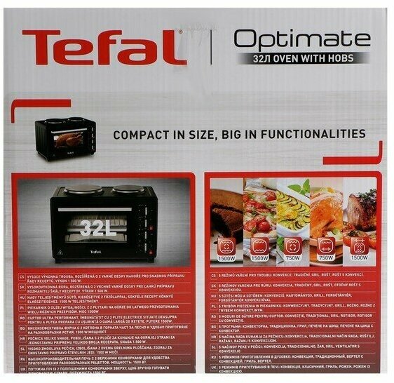 Компактная духовка с двумя конфорками занимает немного места на кухне и предлагает широкий функционал для приготовления самых разных рецептов. Духовка имеет объем 32 л и 5 режимов работы (конвекция, традиционный, гриль, вертел с грилем, вертел с конвекцией).