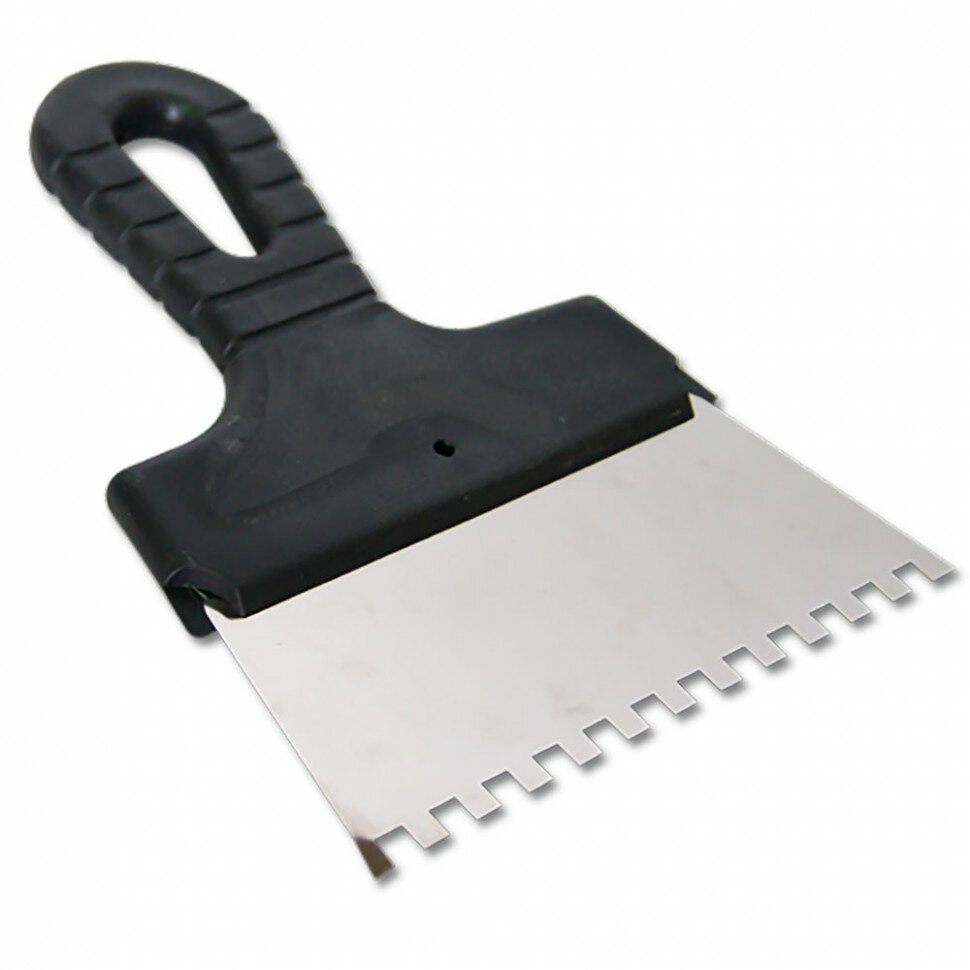 Полотно шпателя изготовлено из нержавеющей стали. Оснащен эргономичной пластмассовой ручкой. Шпатель предназначен для нанесения и выравнивания клеевых и строительных смесей при укладке плитки на поверхностях большой площади. Размер инструмента 150 мм, зуб 6 х 6 мм.
