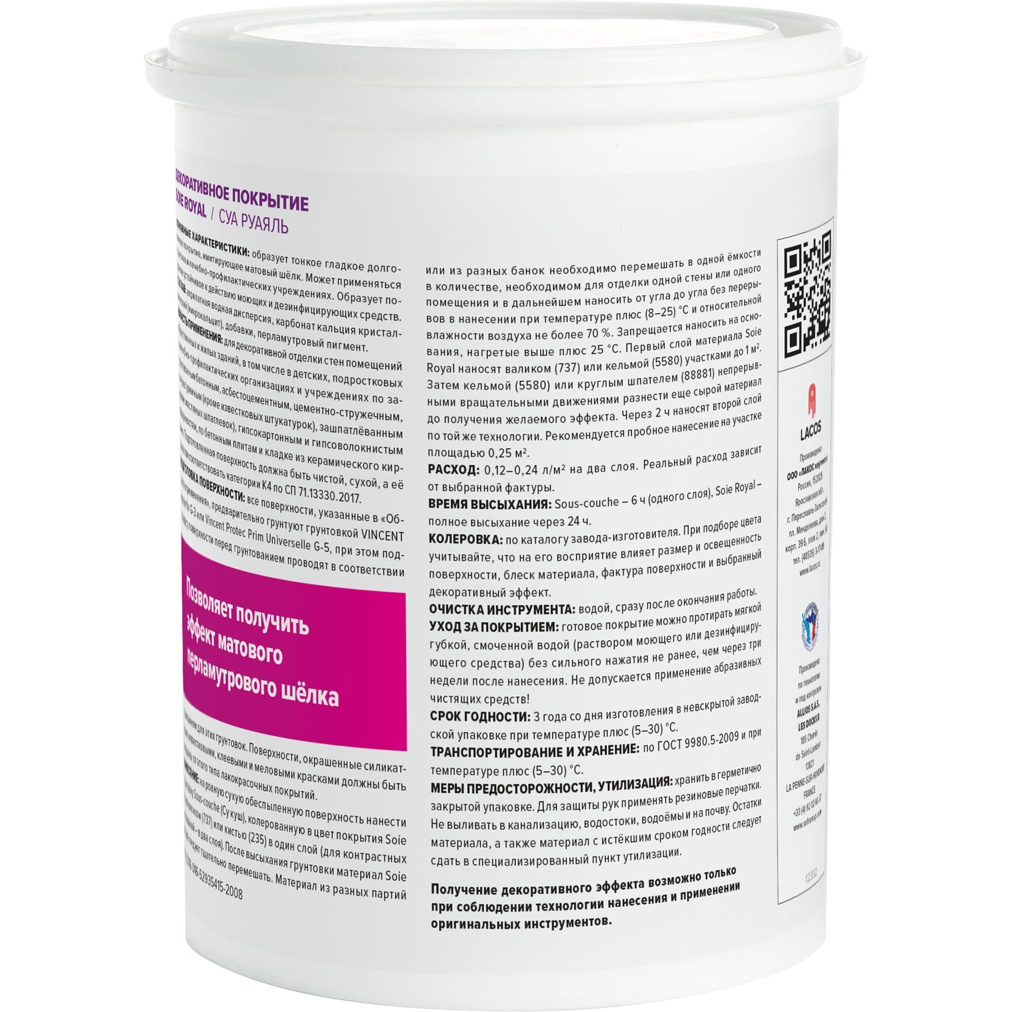 Декоративная штукатурка Vincent Decor Soie Royal с эффектом матового перламутрового шелка (1л) – это высококачественное и надежное решение для создания уникального и стильного интерьера.Штукатурка Vincent Decor Soie Royal имеет белый цвет, который легко колеруется в любой оттенок. Это позволяет создать уникальный дизайн интерьера, соответствующий вашему вкусу и предпочтениям.Vincent Decor Soie Royal подходит для внутренних работ и может быть использована на различных поверхностях, включая бетон, гипсокартон, кирпич, оштукатуренные поверхности, гипсовую шпатлевку и штукатурку.Штукатурка Vincent Decor Soie Royal является готовой к использованию смесью на водно-дисперсионной основе. Время высыхания составляет 24 часа, что позволяет приступить к следующим этапам работы сразу после нанесения.Расход смеси составляет 0,12-0,24 литра на квадратный метр, что делает ее экономичной в использовании.Для защиты рук при работе с декоративной штукатуркой Vincent Decor Soie Royal рекомендуется использовать резиновые перчатки. Остатки материала и материал с истекшим сроком годности следует утилизировать в специализированных пунктах.