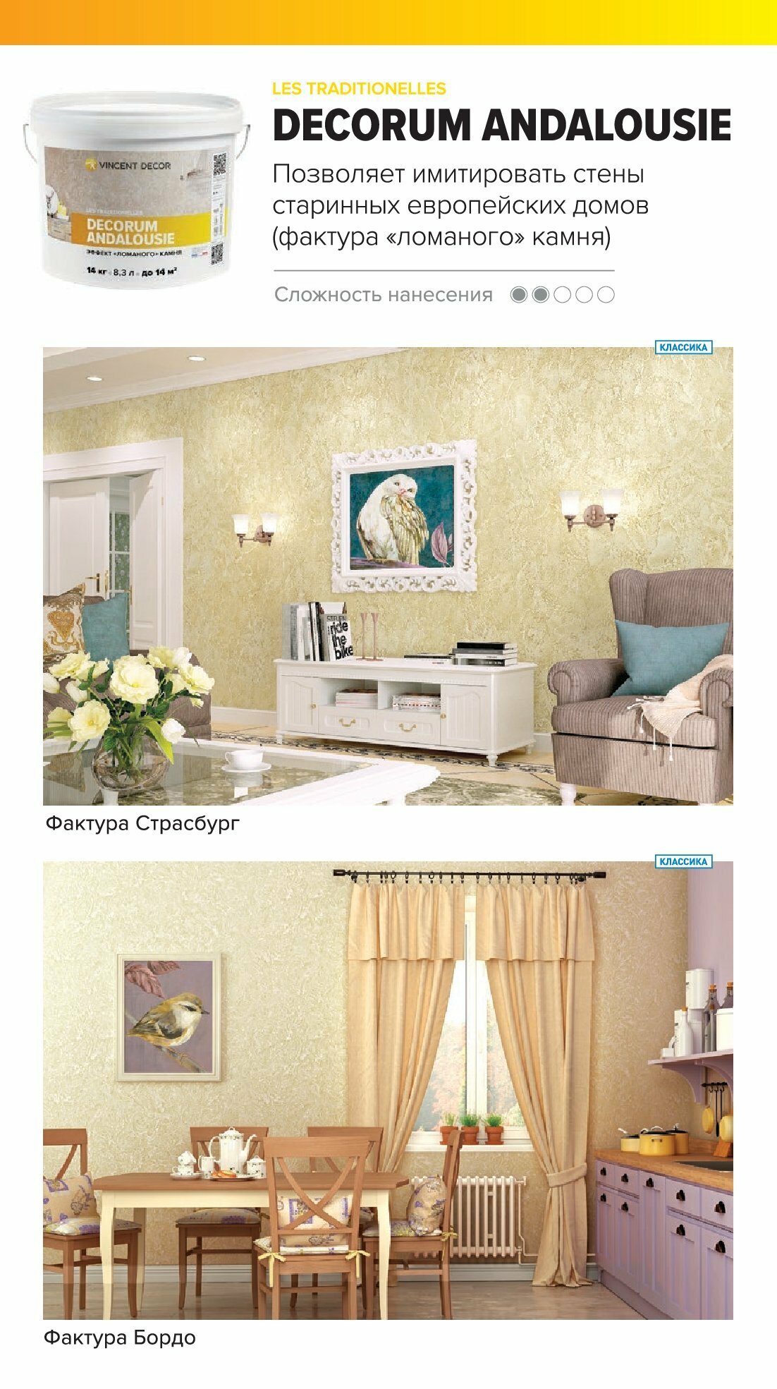 Декоративное структурное покрытие для стен, позволяющее реализовать различные декоративные решения, имитировать стены старинных европейских домов, создавать большое количество декоративных узоров в зависимости от используемых инструментов. Создаваемый рельеф хорошо маскирует мелкие дефекты и неровности поверхности;