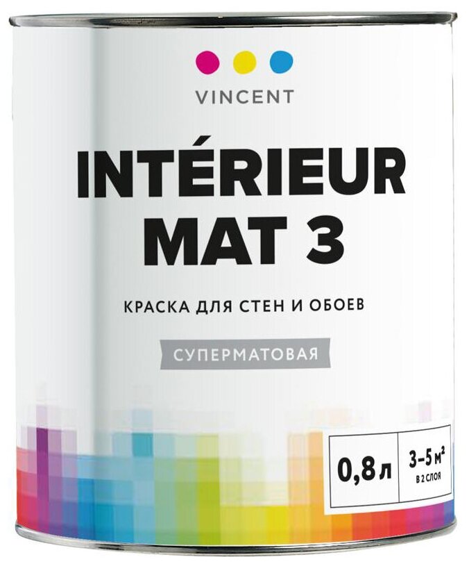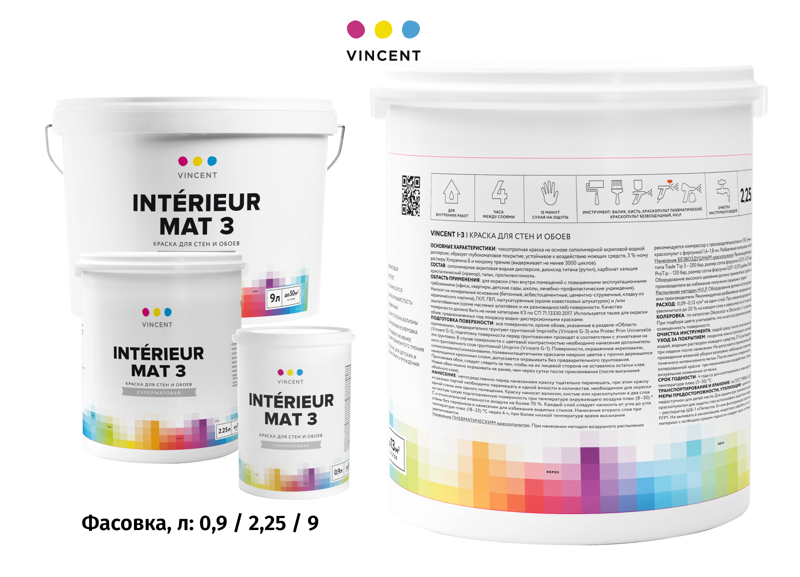 Vincent Intérieur Mat 3 - экологичная водно-дисперсионная матовая краска для потолков, стен и обоев без неприятного запаха с отличным сочетанием потребительских качеств. Образует прочное долговечное покрытие с высокой степенью белизны. Позволяет проводить влажную уборку с использованием моющих и дезинфицирующих средств. Устойчивость к мокрому трению не менее 7000 циклов. ПреимуществаСуперматовая Не желтеет Легко наносится Высокая укрывистость Экономичная Высокая степень белизны Компьютерная колеровка Выдерживает не менее 3000 циклов мокрого тренияОбласть применения Для окраски стен внутри помещений (офисы, квартиры, детские сады, школы, лечебно-профилактические учреждения) по штукатурке, бетону, кирпичной кладке, гипсокартону, волокнисто-цементным плитам. В детских садах, школах и лечебно-профилактических учреждениях применяется в помещениях с обычным («сухим») режимом: коридорах, игровых, буфетных, спальнях, музыкальных, гимнастических и спортивных залах, классных комнатах, кабинетах учителей и врачей, палатах, холлах, вестибюлях, столовых, физиотерапевтических кабинетах и т. п. Состав Сополимерная акрилатная водная дисперсия, диоксид титана (рутил), карбонат кальция кристаллический (мрамор), тальк, пропиленгликоль Расход:по невпитывающей поверхности - 0,08-0,10 л/м2 на один слой по впитывающей поверхности - 0,11-0,125 л/м2Фасовка:0,8 л. 2,7 л. 9 л.Колеровка:по каталогу Decocolor (выпускается в трех базах – A, B, C) Подготовка основания Подготовительные работы должны осуществляться в соответствии со СНиП 3.04.01-87. В зависимости от типа и состояния основания могут производиться следующие виды подготовки: промывание, обработка щетками, пылеудаление, шпатлевание. Поверхность перед нанесением должна быть очищена от пыли, грязи, жира, следов коррозии, высолов, масляных и битумных пятен, биоповреждений. В случае необходимости произвести выравнивание с помощью цементного раствора или цементно-известкового раствора по штукатурке. Новые и старые неокрашенные основания Бетон, бетонные облицовочные плиты, асбестоцемент, ЦСП, цементная штукатурка и штукатурка на основе синтетических смол - допускается наносить краску без предварительного грунтования или через VINCENT G-5. В случае контрастных, а также неравномерно впитывающих оснований грунтование поверхности обязательно. Известковые и цементно-известковые штукатурки - рекомендуется нанести грунтовку VINCENT G-1. Керамический (глиняный) кирпич - допускается наносить без предварительного грунтования или через VINCENT G-1. Гипс - нанести укрепляющую грунтовку VINCENT G-3. Металл – нанести специальную антикоррозионную грунтовку VINCENT G-4. Все минеральные основания (бетон, штукатурка) перед окраской и грунтованием должны иметь возраст не менее 28 суток. Перед нанесением необходимо убедиться, что основание не .